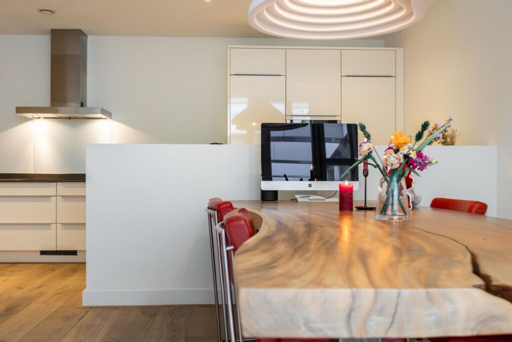 Met uitzondering van de natte ruimtes is de gehele woning voorzien van een mooie, hoogwaardige houten vloer met vloerverwarming en koeling.