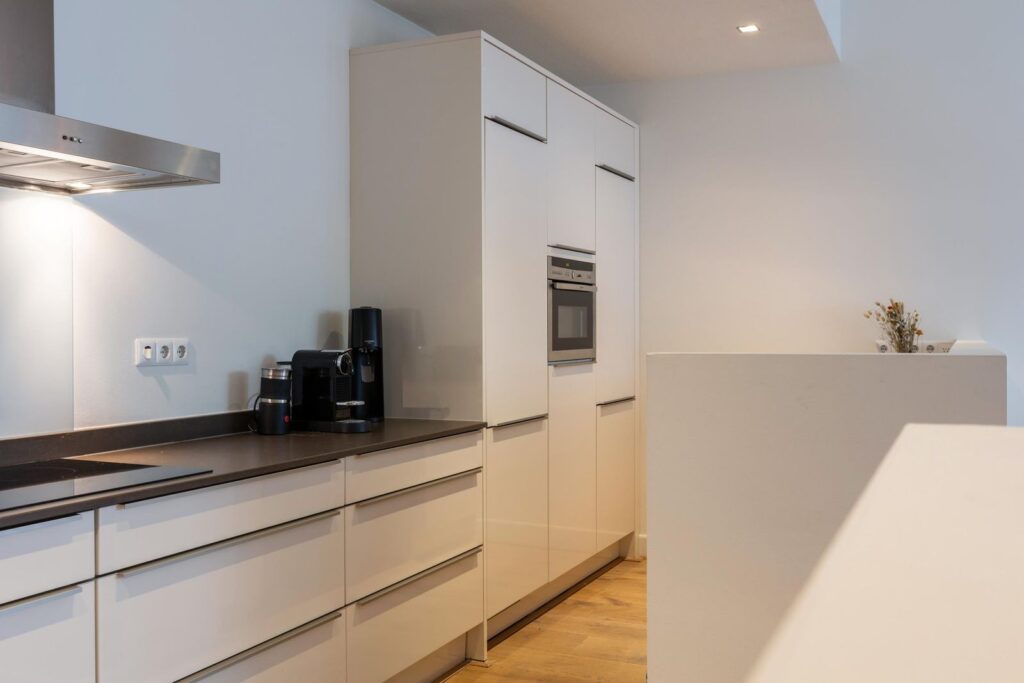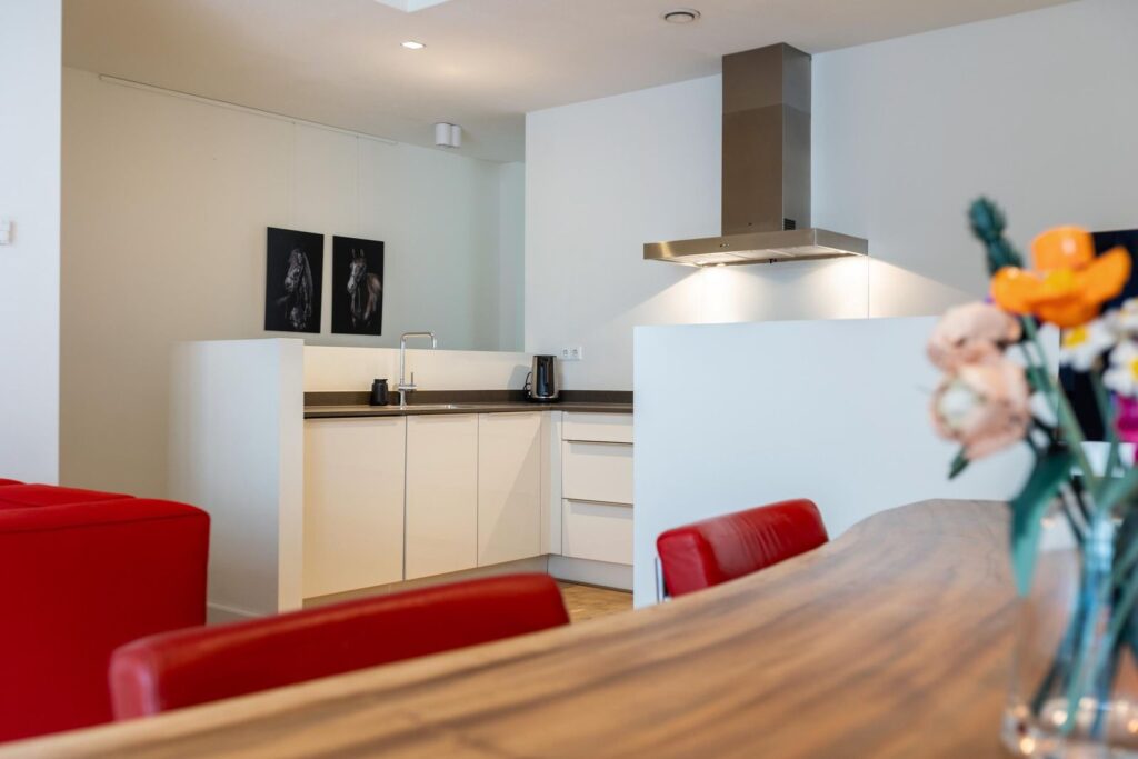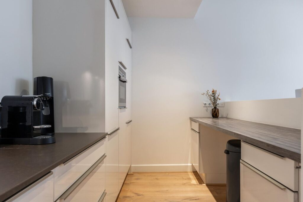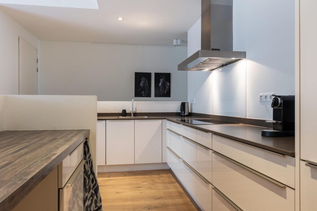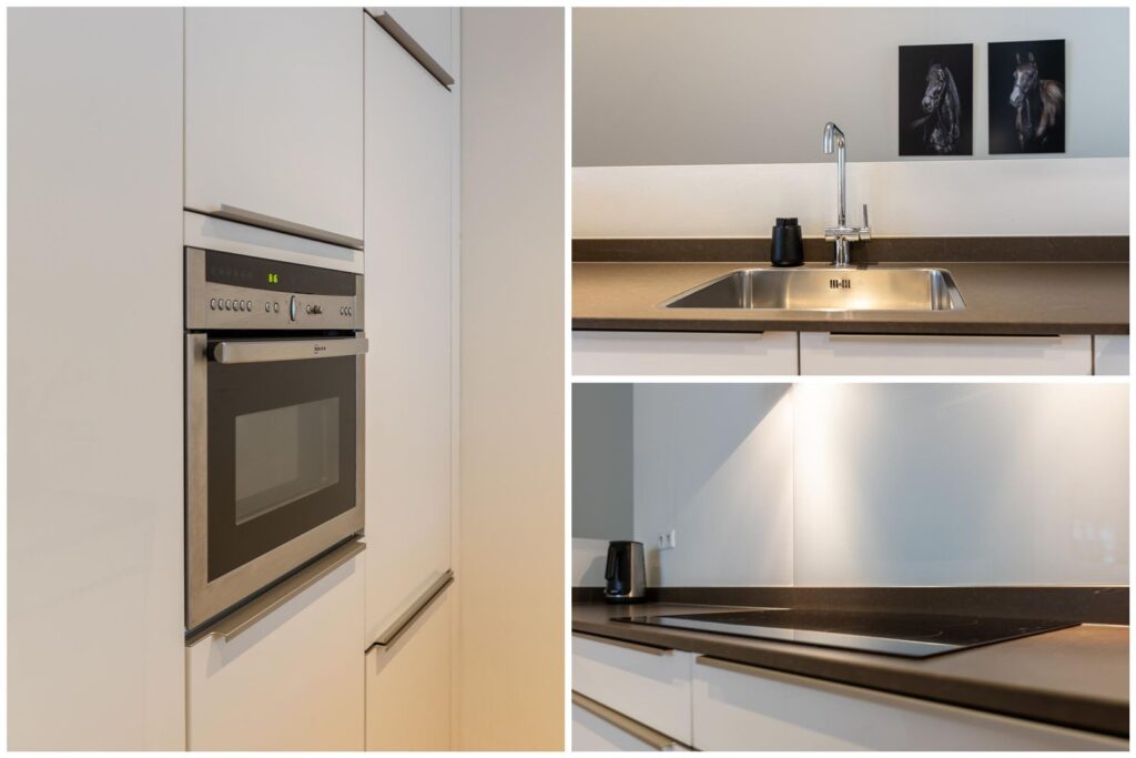 De moderne open keuken is een waar paradijs voor kookliefhebbers. Voorzien van hoogwaardige inbouwapparatuur, waaronder een inductiekookplaat, rvs-afzuigkap, koelkast, vriezer, vaatwasser, een combi-oven en biedt meer dan voldoende ruimte voor het servies en ander keukengerei. Hier kun je je culinaire vaardigheden naar een hoger niveau tillen.