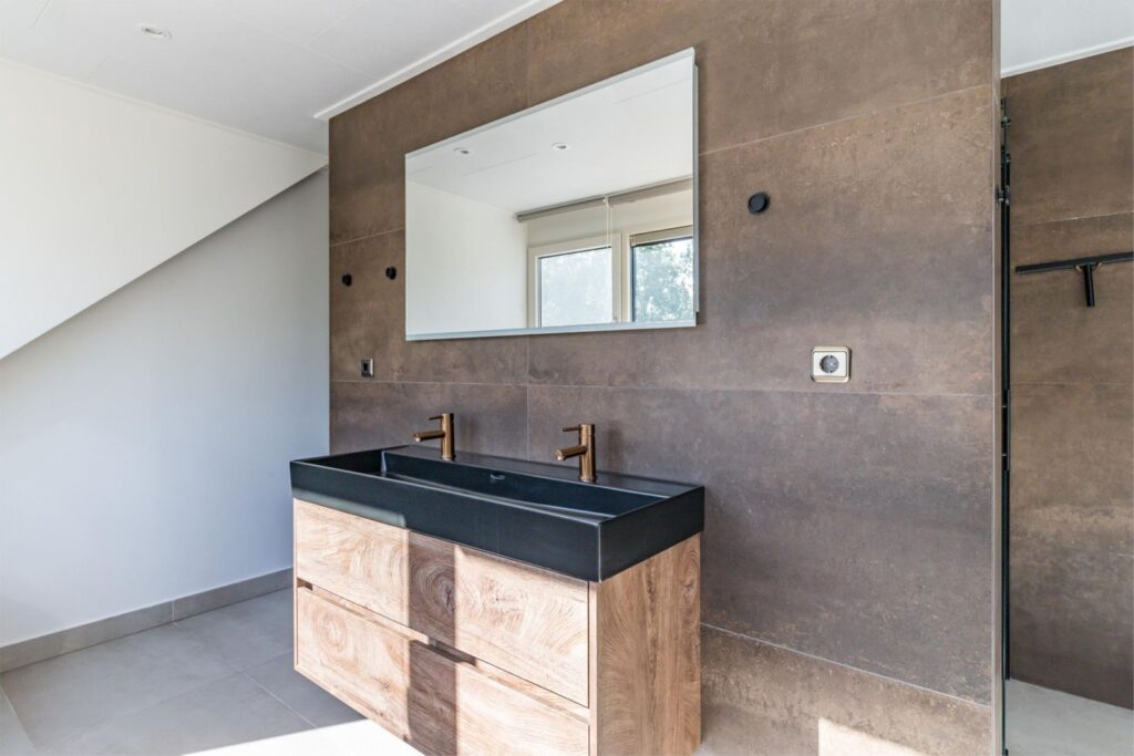 Eerste verdieping: overloop, royale slaapkamer (gerealiseerd door samenvoegen van twee kamers), badkamer voorzien van douche, toilet en wastafel, tweede slaapkamer, doorloopkamer in gebruik als kastenkamer, derde ouderslaapkamer met dakkapel en aangrenzende moderne badkamer voorzien van inloopdouche, toilet, dubbele wastafel met meubel, vloerverwarming en handdoekradiator, hal met trapopgang naar de zolder.