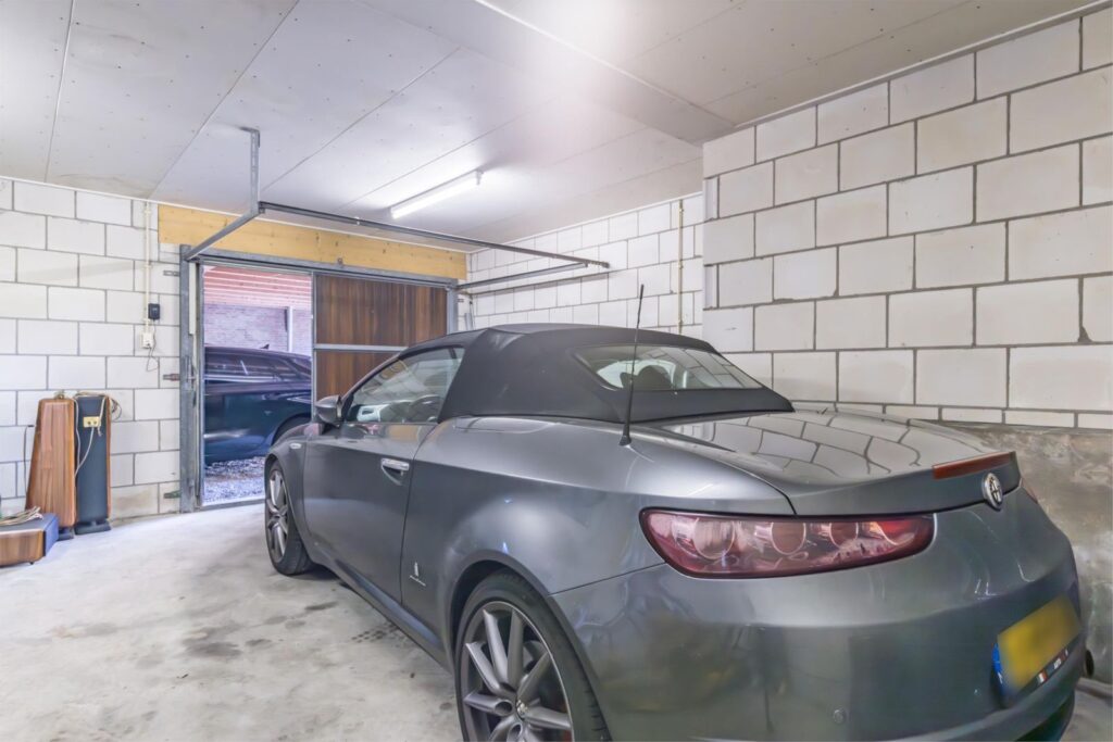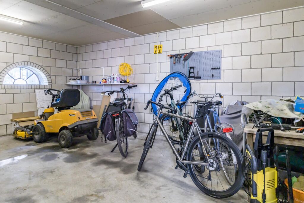 Het bijgebouw bestaat uit een garage met plaats voor een auto aan de achterzijde, een tweede open garage aan de voorzijde, een voormalig varkenshok en een afsluitbare berging. Het bijgebouw beschikt over een vliering die niet in gebruik is. Daarnaast is er een carport met ruimte voor twee auto’s.