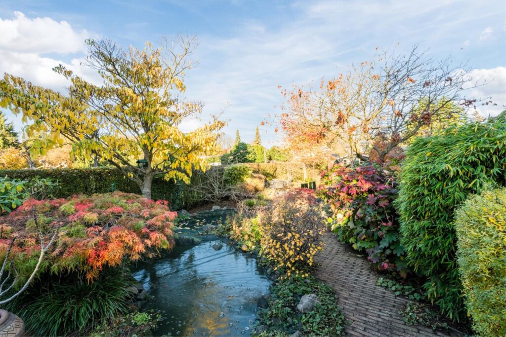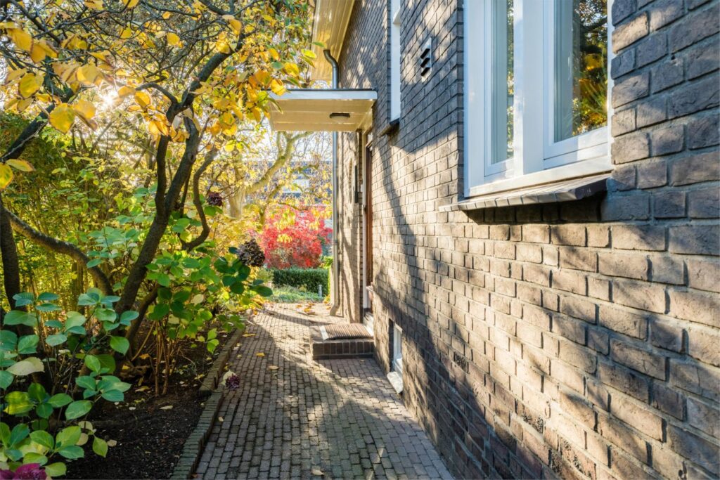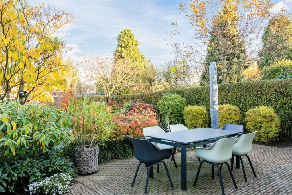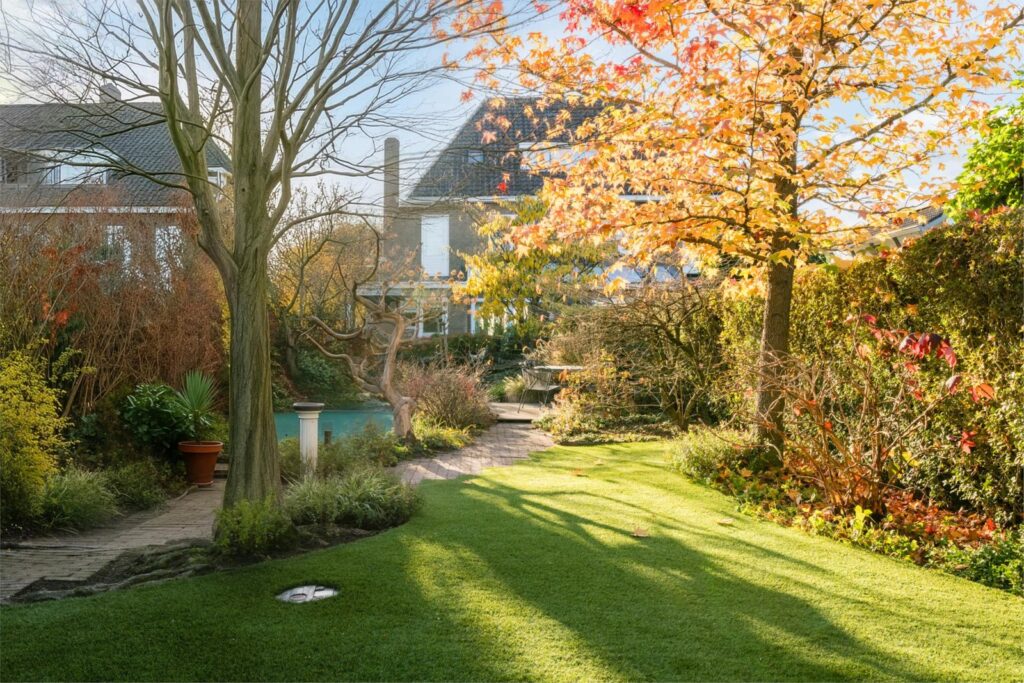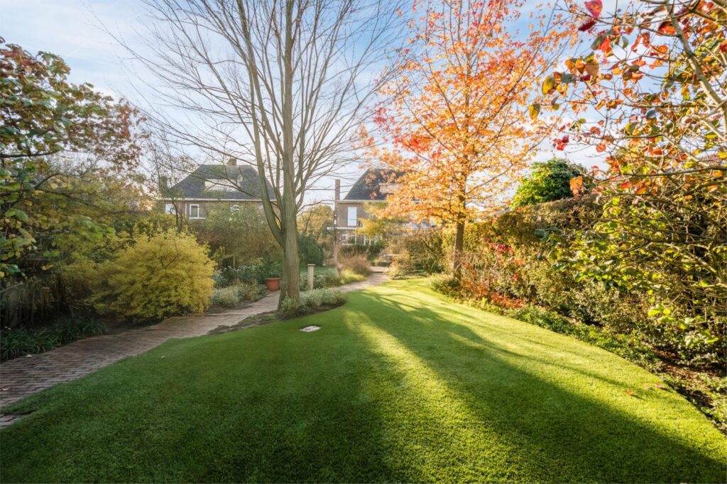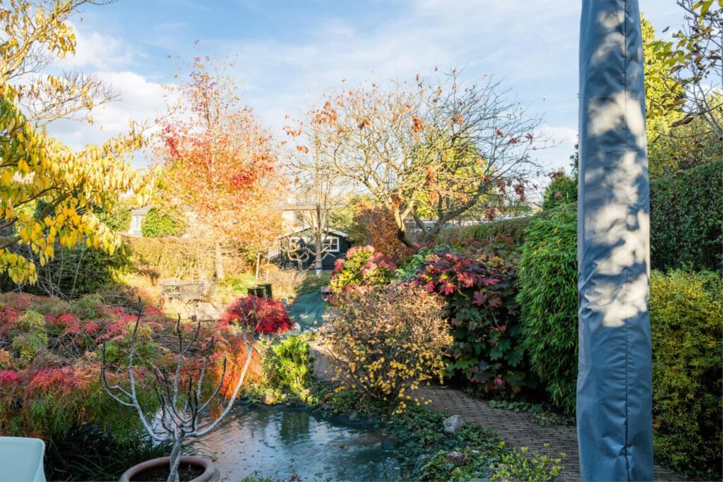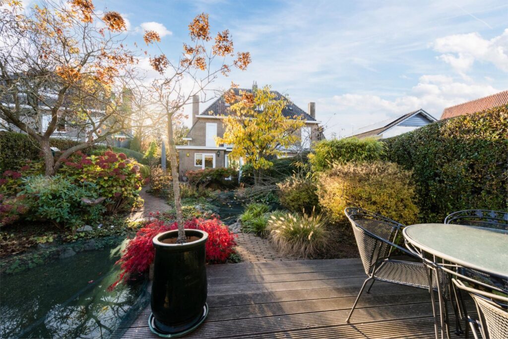 De achtertuin is een groene, volledig omsloten oase met een perfecte mix van zon en schaduw. Je vindt er vijvers, vlonders, borders, een eigen grondwaterput met elektrische pomp en sproeipunten en meerdere terrassen in de tuin. Of je nu wilt tuinieren, spelen, ontspannen of gezellig tafelen: deze tuin maakt het allemaal mogelijk.