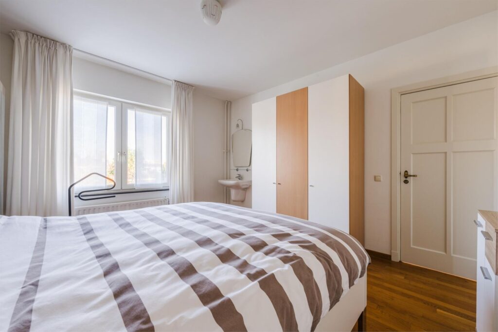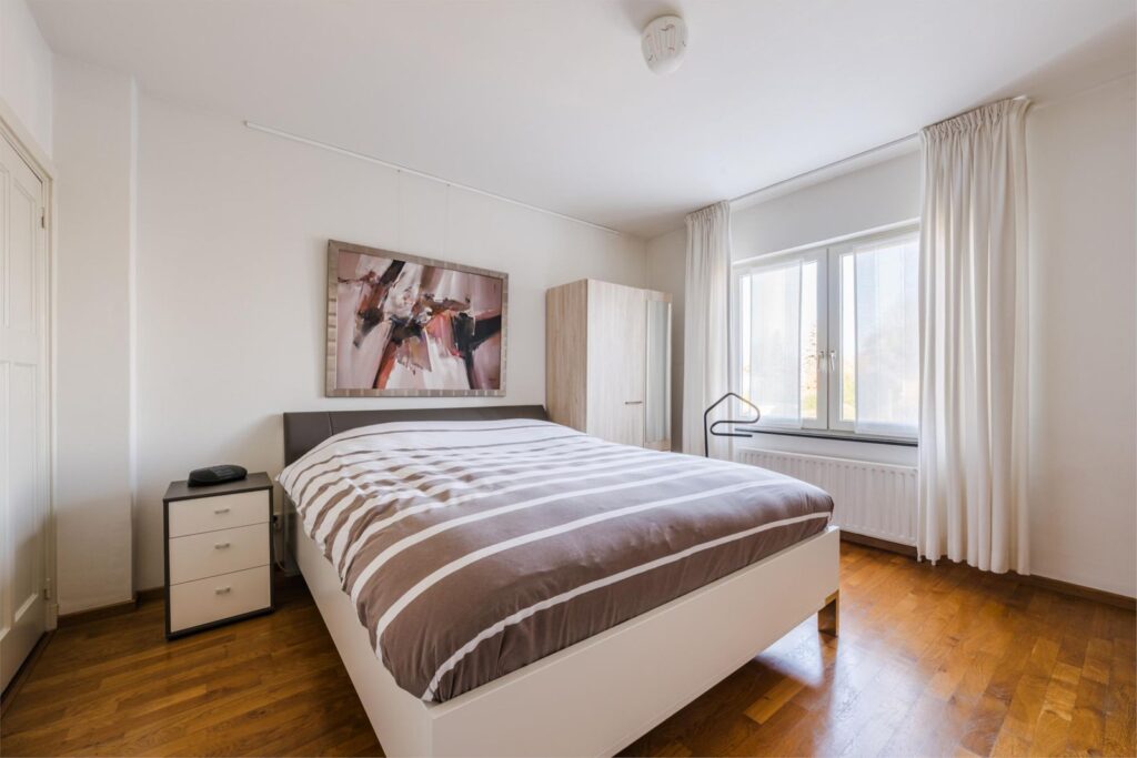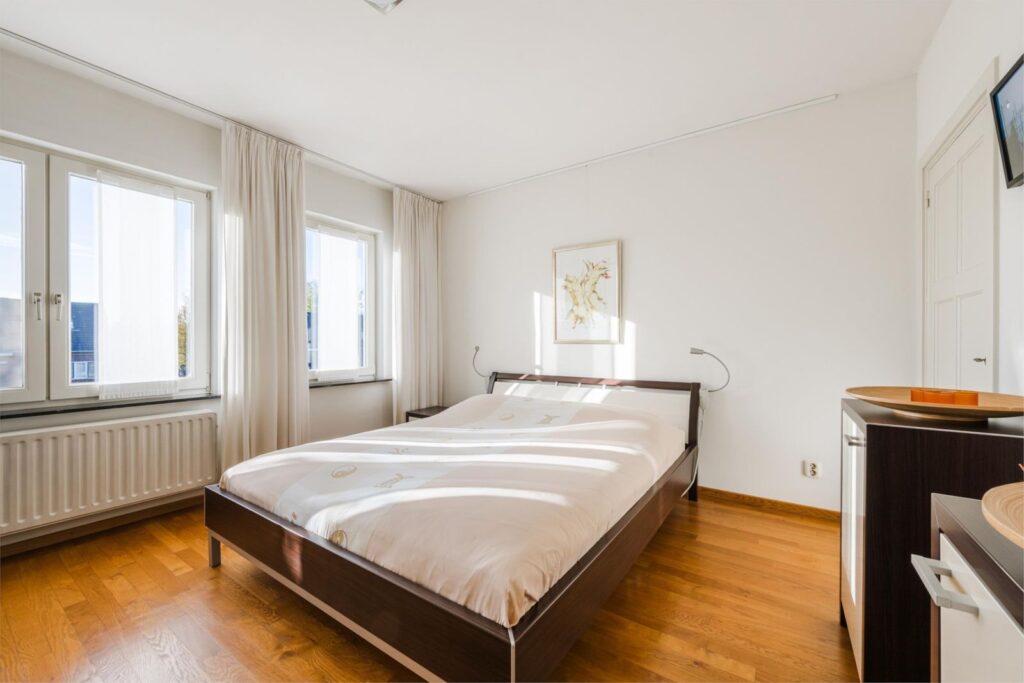 Via deze overloop heeft u toegang tot twee ruime slaapkamers (beiden ca.16 m²) en een kleine slaapkamer (ca. 5,5 m²) die zorgen voor rust en comfort. De twee grote slaapkamers hebben ingebouwde kasten. De kleine slaapkamer op de 1e verdieping geeft toegang tot het platte dak.