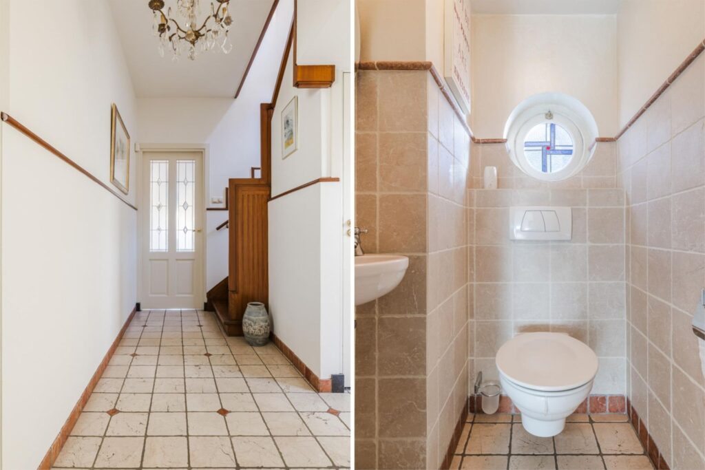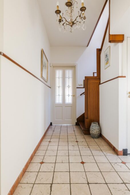 Via de statige voordeur kom je binnen in een ruime hal met tegelvloer, kapstok en een toilet.