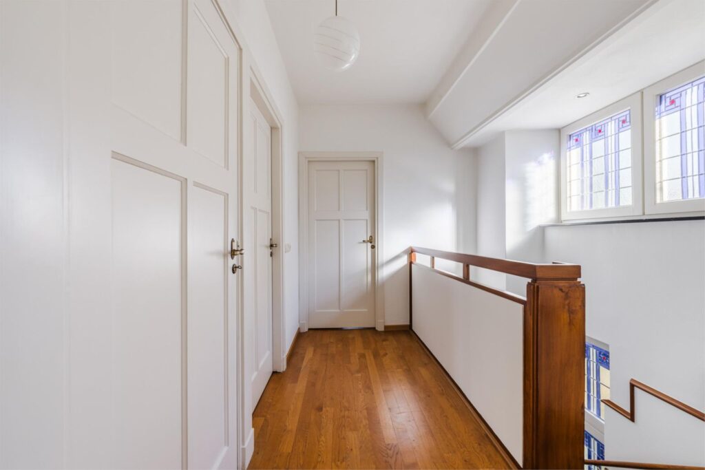 Het trappenhuis trekt direct de aandacht: een mooie hardhouten trap, een prachtige glas-in-loodpartij laat warm licht binnenstromen en zet meteen de toon.