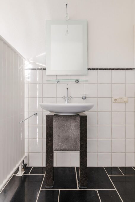 De badkamer is stijlvol ingericht met een royale inloopdouche, een ligbad, een zwevend badkamerkastje, een wastafel en een toilet.