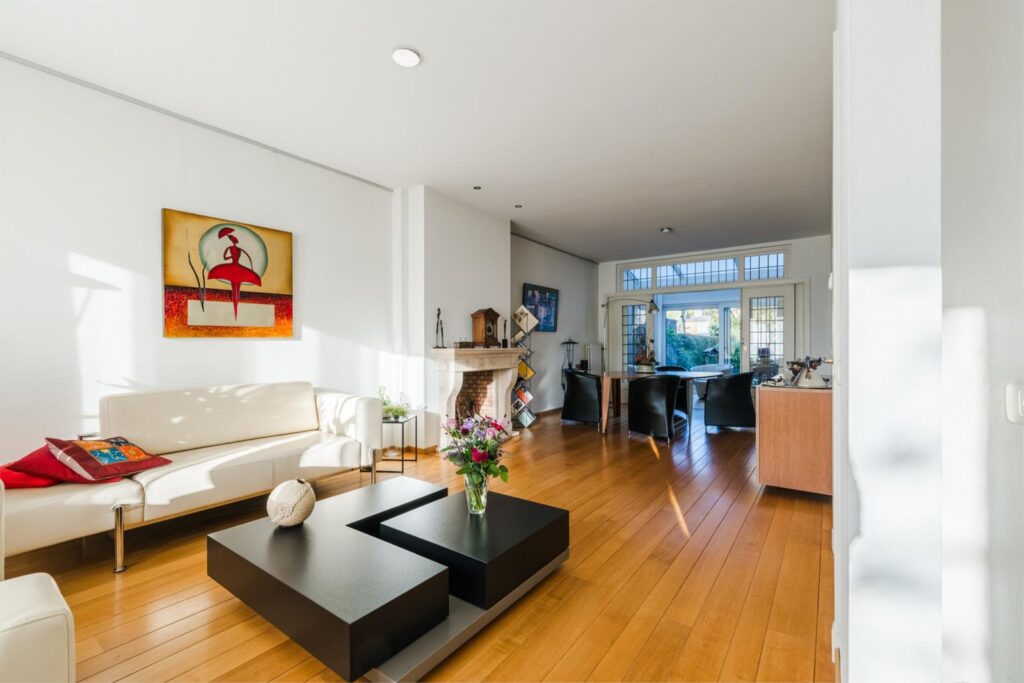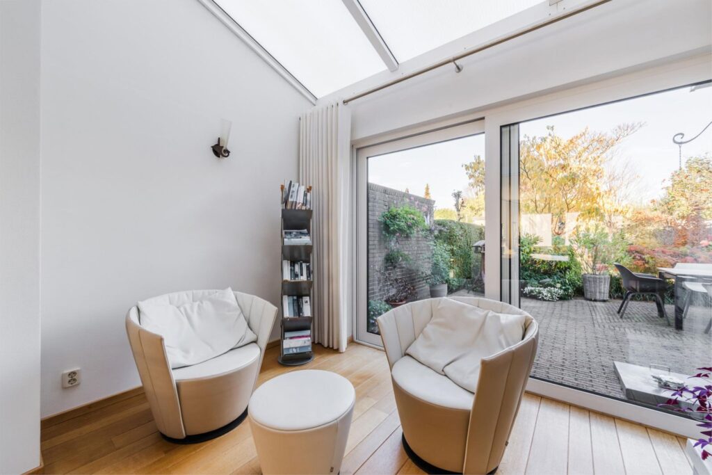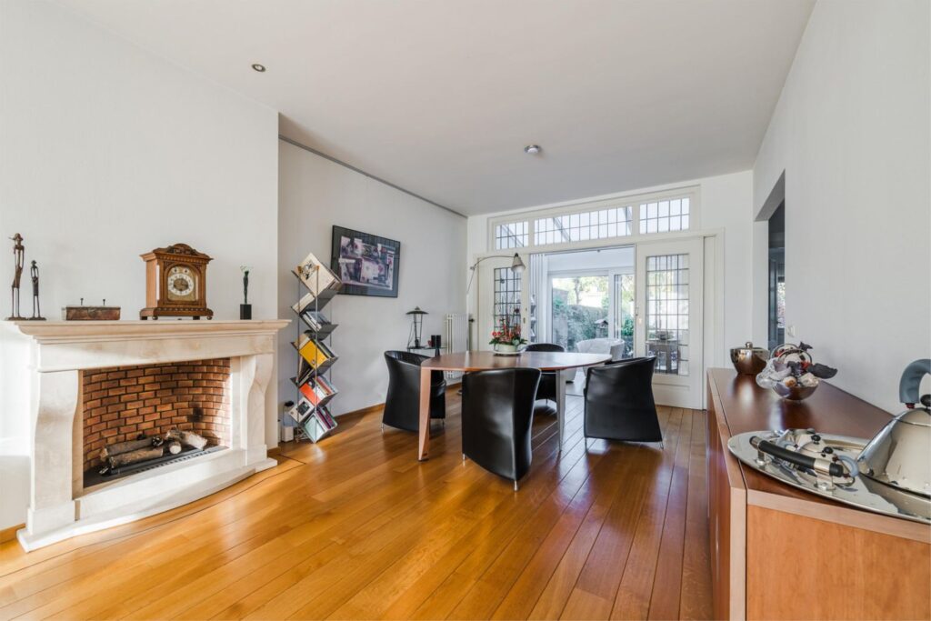 Aan de voorzijde bevindt zich de woonkamer, met een sfeervolle erker, parketvloer, een open gashaard met stenen schouw en een serre met zicht op de tuin. De originele en-suitedeuren leiden naar deze serre waar je je kunt terugtrekken om te lezen of van de zon en de vogels in de tuin te genieten. Deze ruimte heeft een grote metalen schuifpui die toegang geeft tot de royale tuin met vijvers, aangelegd door een tuinarchitect.