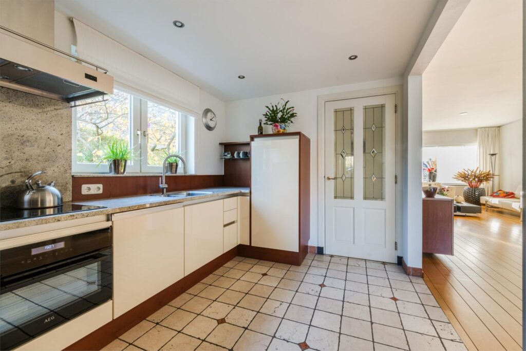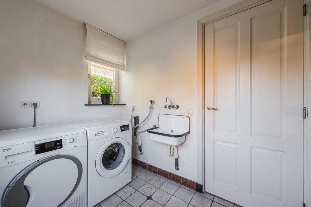 De praktische keuken met natuurstenen werkblad en een aparte opslagkast, geeft toegang tot de bijkeuken voor de witgoedopstelling. Hier bevindt zich ook een kastenwand met originele deuren en een wasbak met kraan.