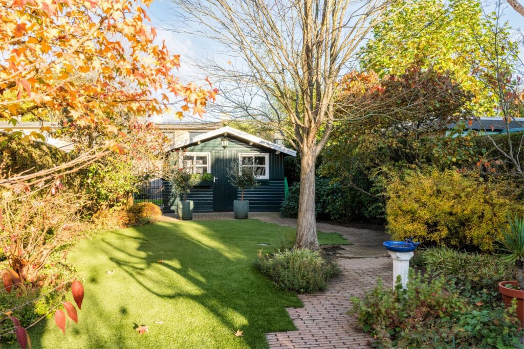 Achter in de tuin staat een tuinhuis voor de opslag van tuingereedschap en tuinmeubels.