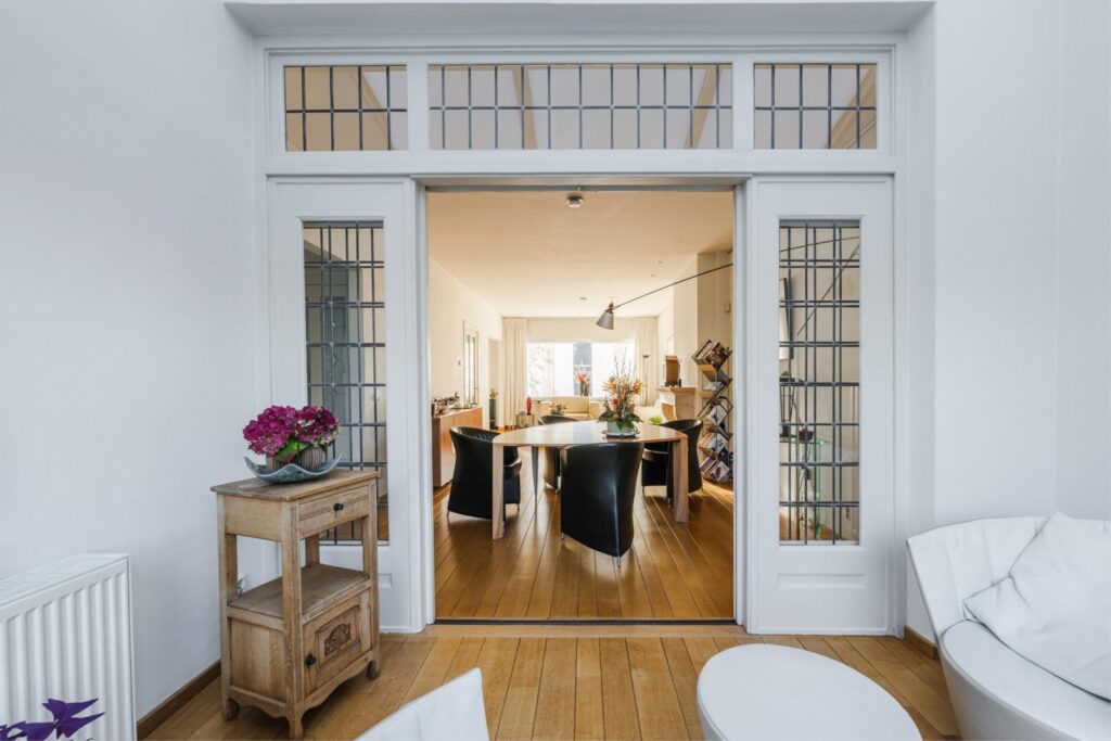 Glas-in-lood ramen, en-suite deuren, ingebouwde kastenwand in de bijkeuken, het trappenhuis en ingebouwde kasten op 2 slaapkamers.