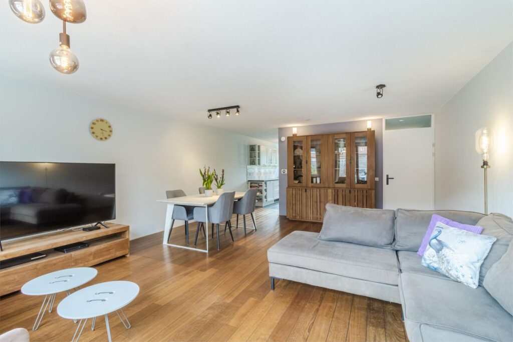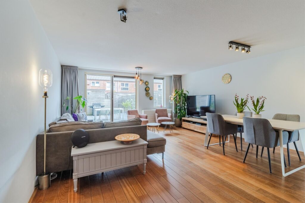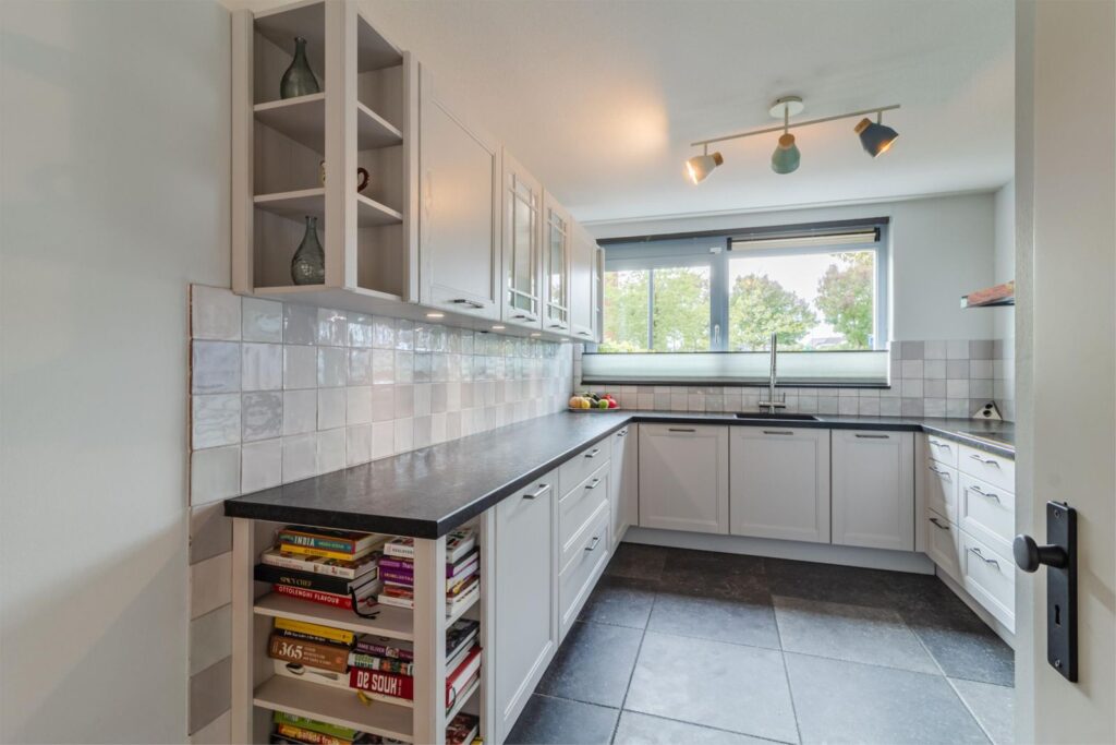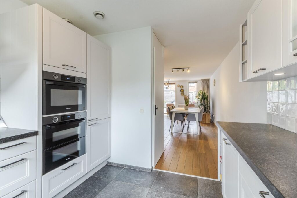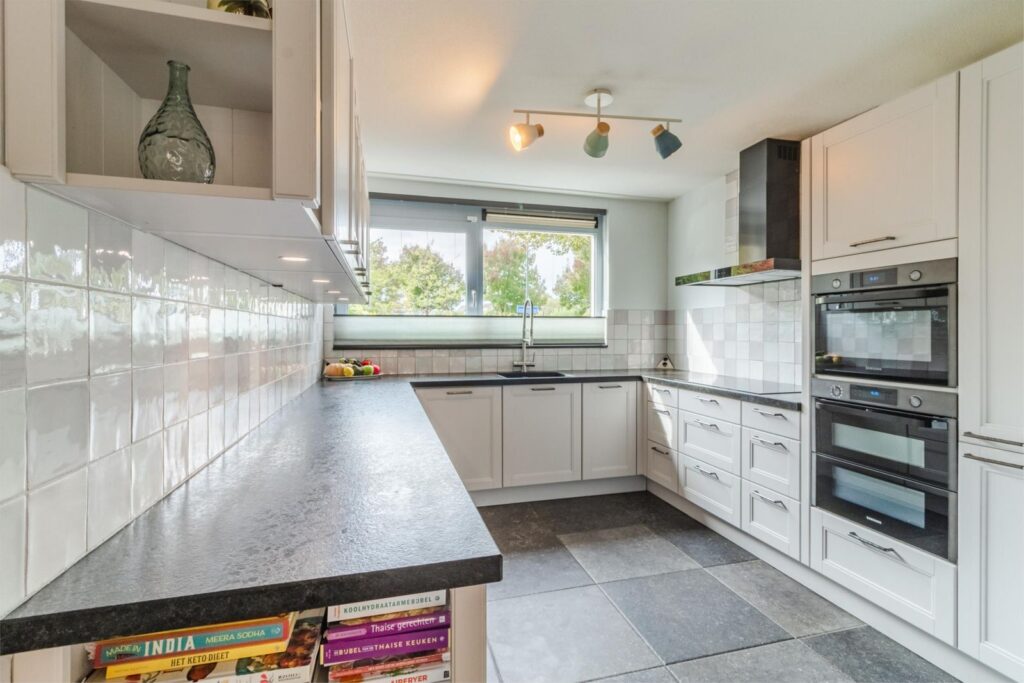 Via de hal komt u in de ruime, lichte woonkamer met uitbouw voor extra leefruimte. Een schuifpui geeft toegang tot de gezellige terrastuin. In de ruime, open keuken komt landelijke warmte samen met modern comfort. De U-vormige opstelling biedt een overvloed aan werk- en opbergruimte, terwijl de moderne apparatuur met onder andere een direct-kokend-waterkraan zorgt voor optimaal kookgemak. Door de open verbinding met de woonkamer is deze keuken echt een sociale plek waar koken en gezelligheid samen gaan.