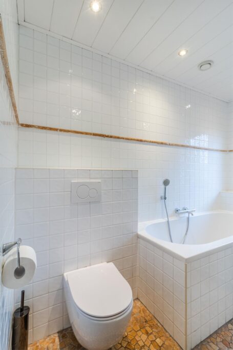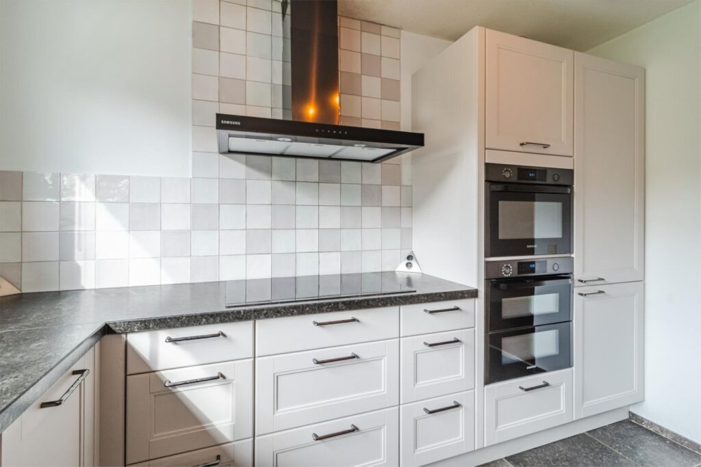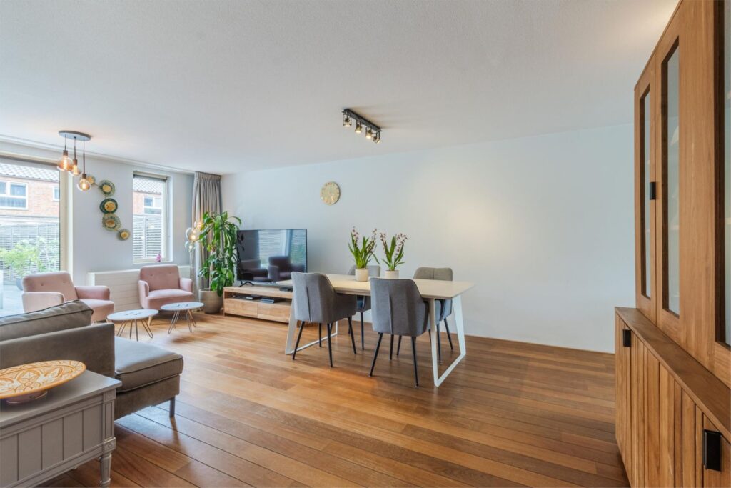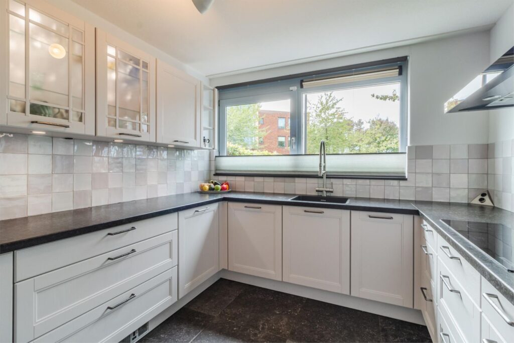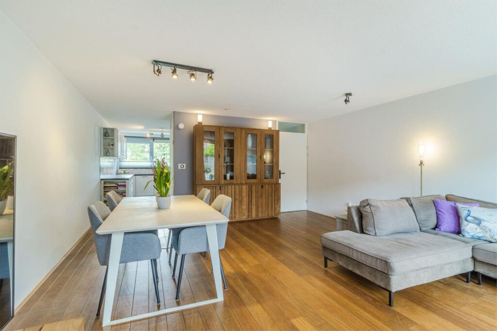 Via de hal komt u in de ruime, lichte woonkamer met uitbouw voor extra leefruimte. Een schuifpui geeft toegang tot de gezellige terrastuin. In de ruime, open keuken komt landelijke warmte samen met modern comfort. De U-vormige opstelling biedt een overvloed aan werk- en opbergruimte, terwijl de moderne apparatuur met onder andere een direct-kokend-waterkraan zorgt voor optimaal kookgemak. Door de open verbinding met de woonkamer is deze keuken echt een sociale plek waar koken en gezelligheid samen gaan.
