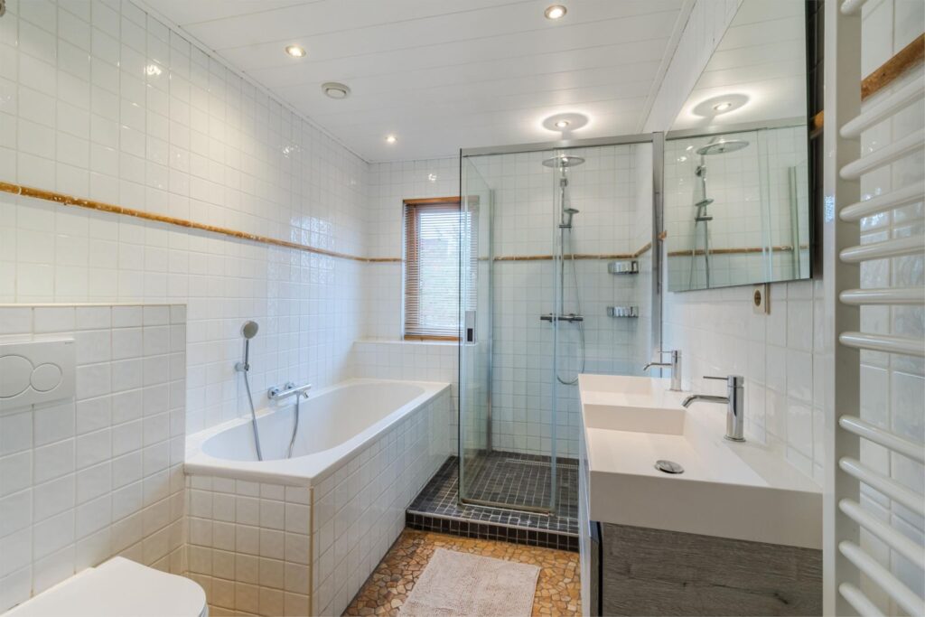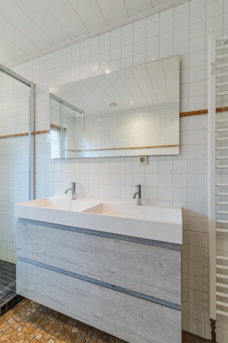 Op de eerste verdieping zijn twee slaapkamers. De eerste slaapkamer is royaal van omvang en kan, indien gewenst, eenvoudig worden gesplitst naar twee kamers. De tweede kamer is uitstekend aan te passen aan uw wensen en kan worden gebruikt als kinderkamer, logeerkamer of thuiskantoor. De badkamer is uitgerust met een bad, ruime douche en dubbele wastafel.