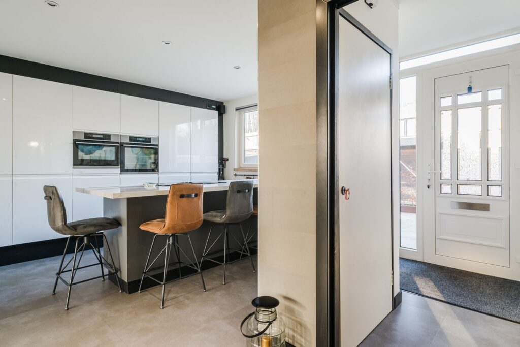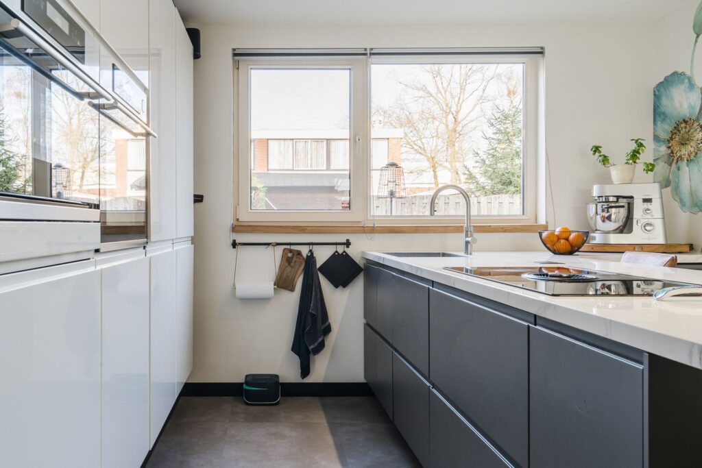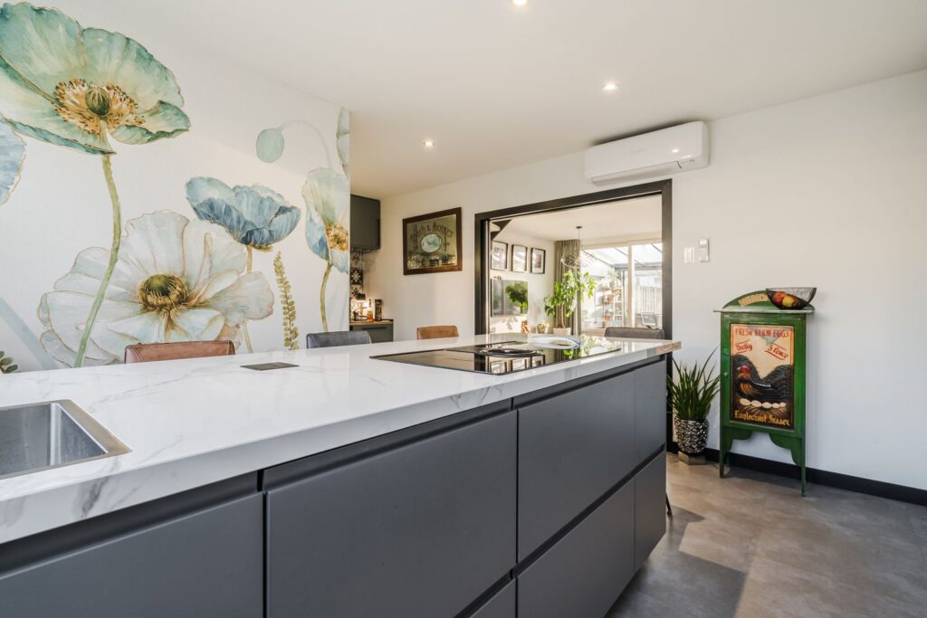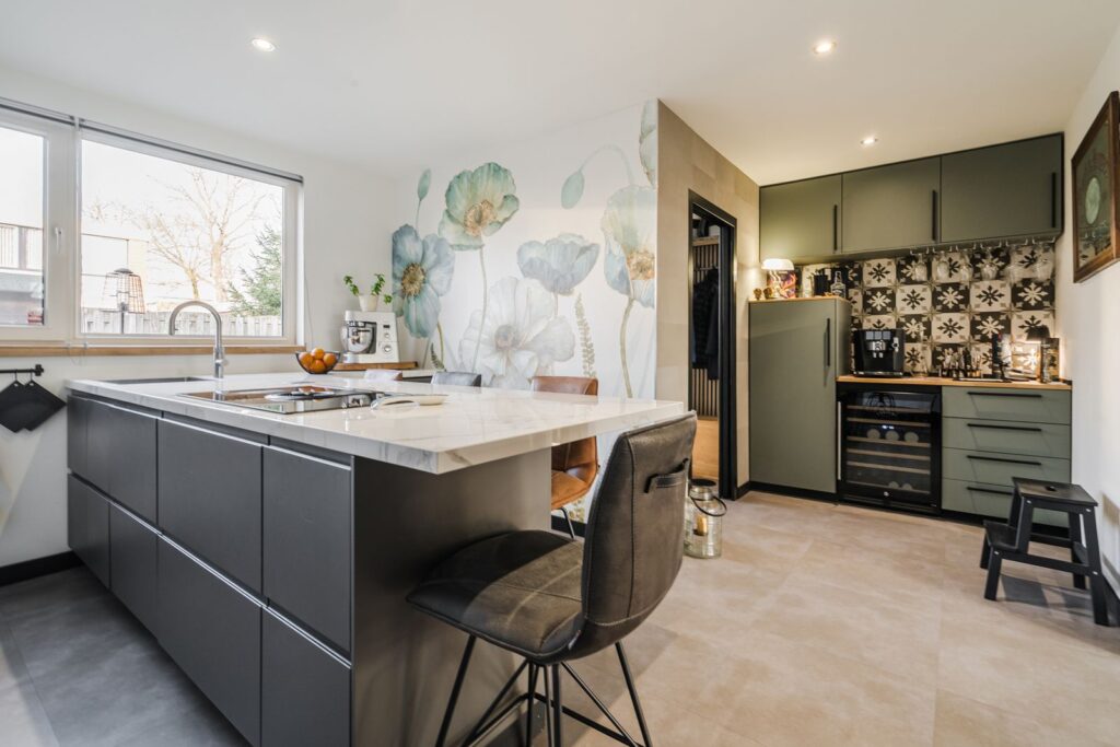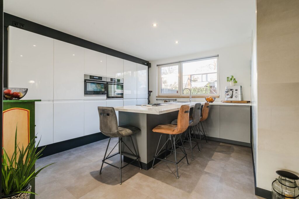 De open keuken, uitgevoerd in een lichte kleurstelling, is gesitueerd aan de voorzijde van de woning. De keuken heeft een praktische indeling met een kastenwand en een (schier)eiland en is uitgerust met diverse inbouwapparatuur, waaronder een inductiekookplaat met afzuiging, 5 in 1 Quooker, oven, combi magnetron, koelkast en vaatwasser. Daarnaast is er volop bergruimte in de kasten.