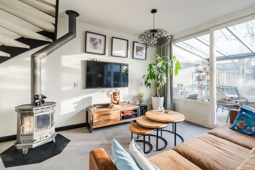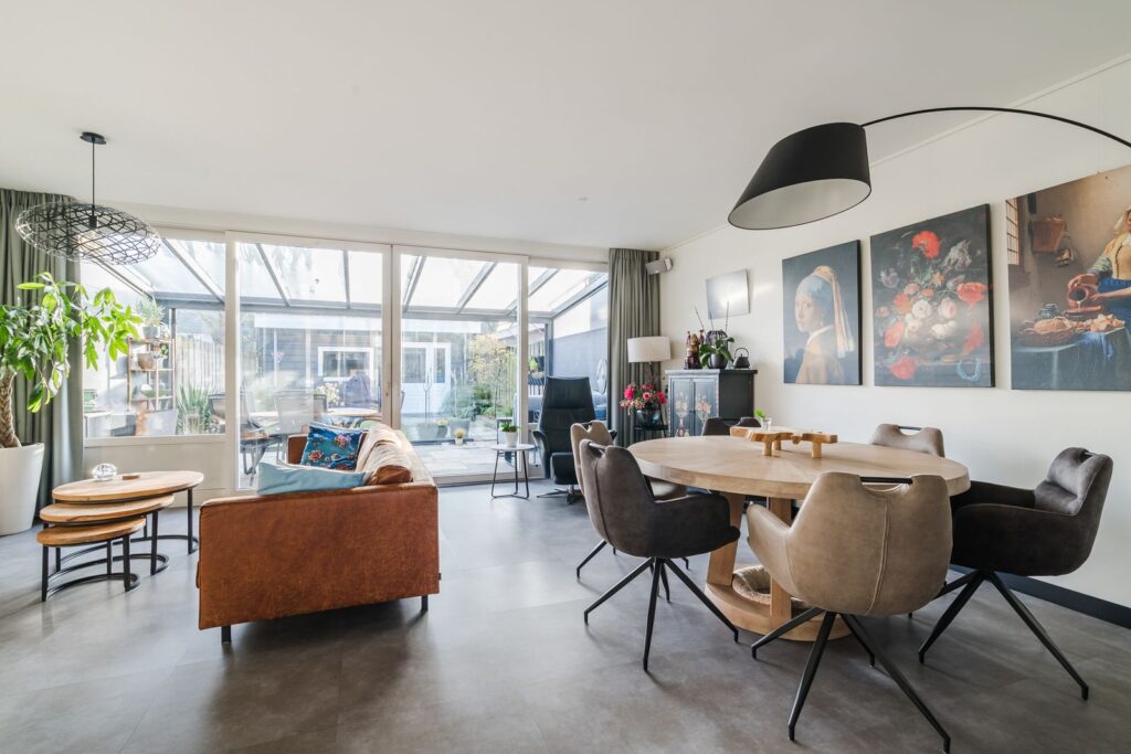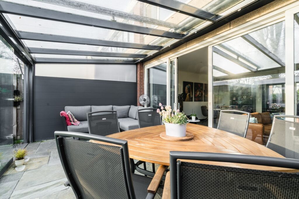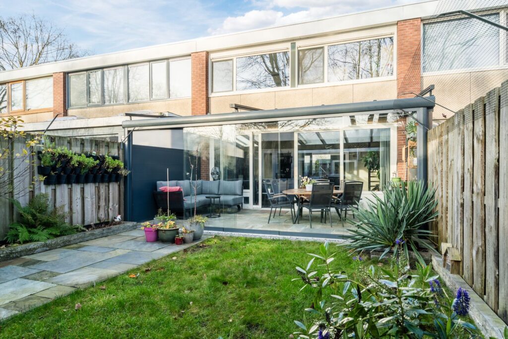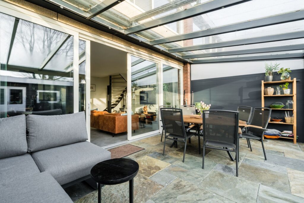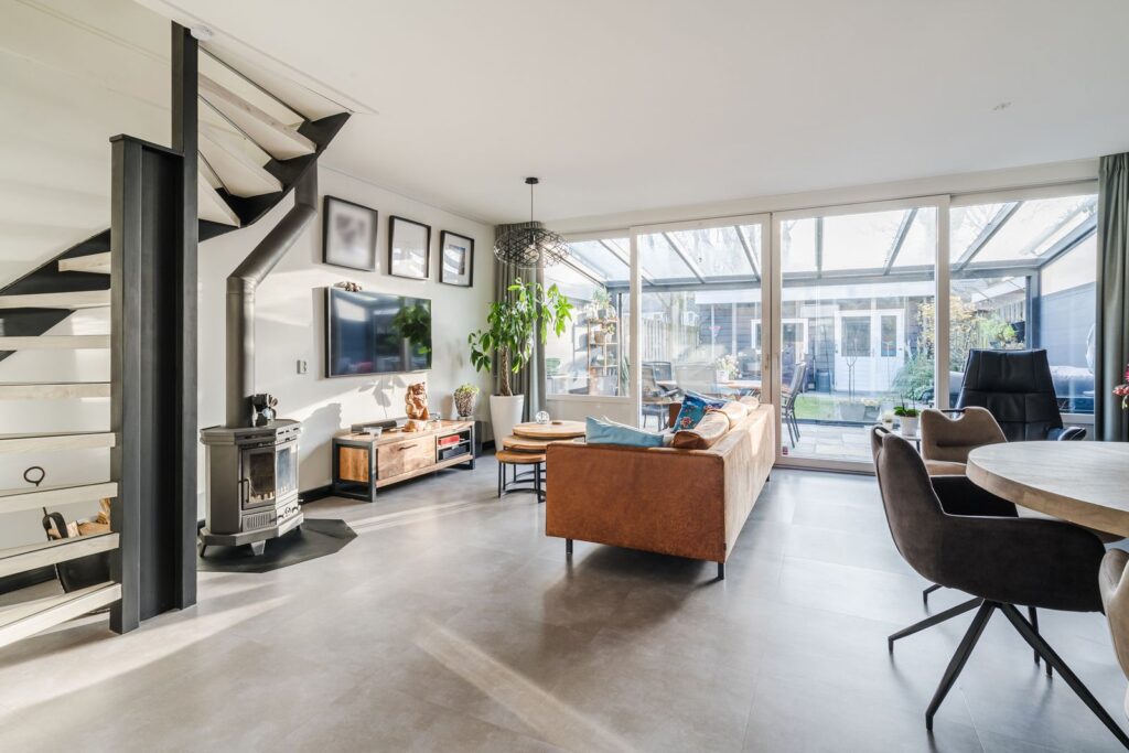 De tuingerichte woonkamer (circa 6 meter breed) is een fijne, lichte ruimte dankzij een schuifpui over de gehele breedte en heeft een sfeervolle houtkachel – perfect voor de koude avonden. Vanuit de woonkamer is er fraai zicht op de zonnige achtertuin. Direct aan de woonkamer is over de gehele breedte een glazen/aluminium serre aangebouwd welke geheel met glazen deuren afgesloten kan worden. De serre beschikt over een zonnescherm dat voor aangename schaduw zorgt op warme dagen. Zowel de keuken als de woonkamer zijn voorzien van Airco’s die zowel kunnen verwarmen als koelen.