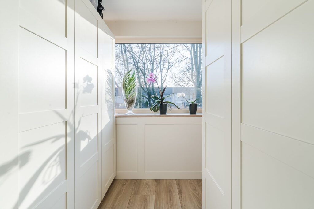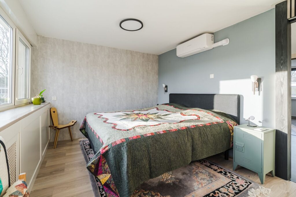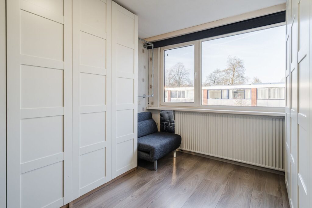 Aan de achterzijde van het huis bevind zich de hoofd slaapkamer waar dmv kasten een “walk-in closet” is gerealiseerd. De grote raampartij biedt een fraai zicht op de tuin en zijn middels elektrische rolluiken te blinderen. De slaapkamer is tevens voorzien van een airco die zowel kan verwarmen als koelen. Aan de voorzijde van het huis bevinden zich de andere twee slaapkamers.