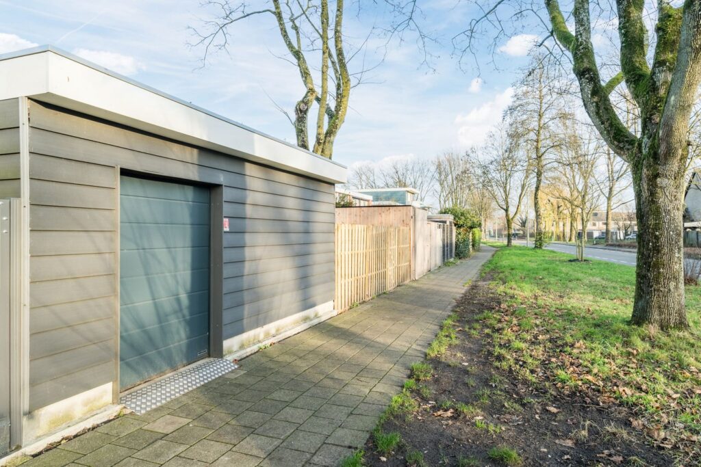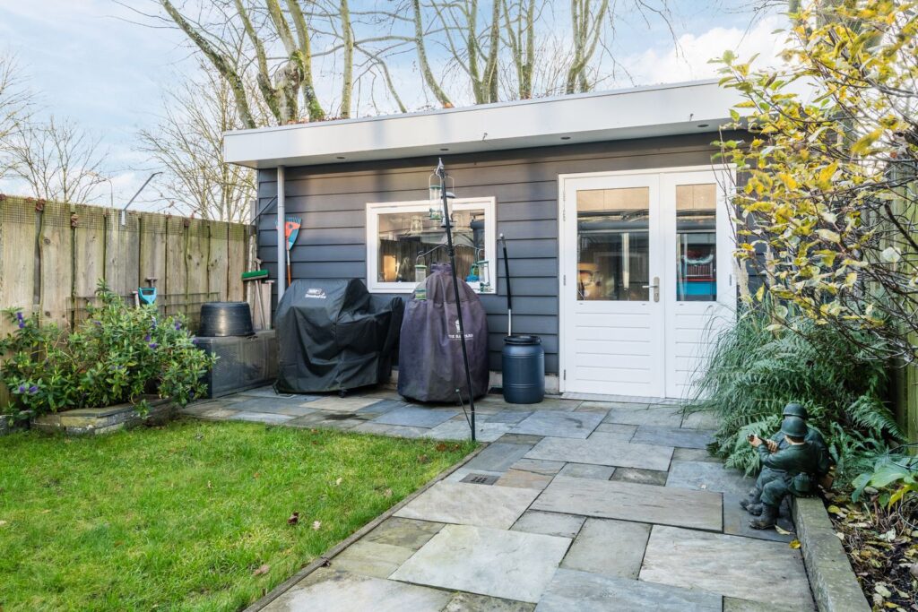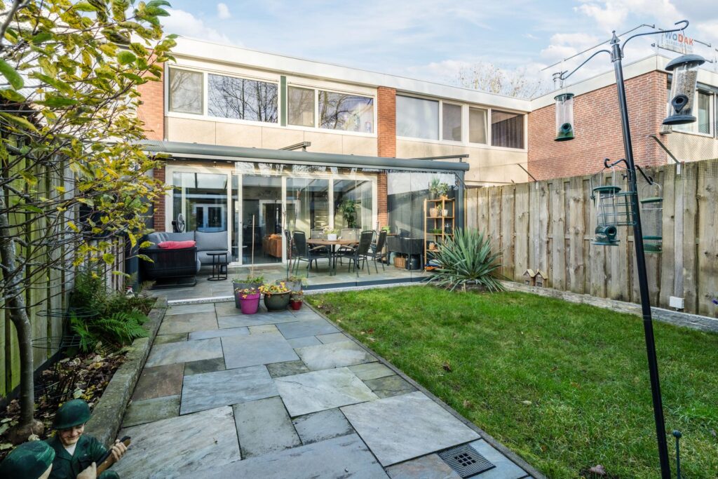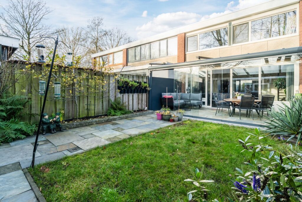 De achtertuin, gelegen op het zuiden, biedt rust, zon en privacy. In de serre kun je ook tijdens een zomerse bui heerlijk buiten zitten. En met een beetje zon is het er ook in het voor- en najaar heerlijk toeven. De achterzijde van de tuin is middels een grote berging geheel afgesloten. Door middel van grote deuren aan beide zijde van de berging is de tuin achterom bereikbaar.