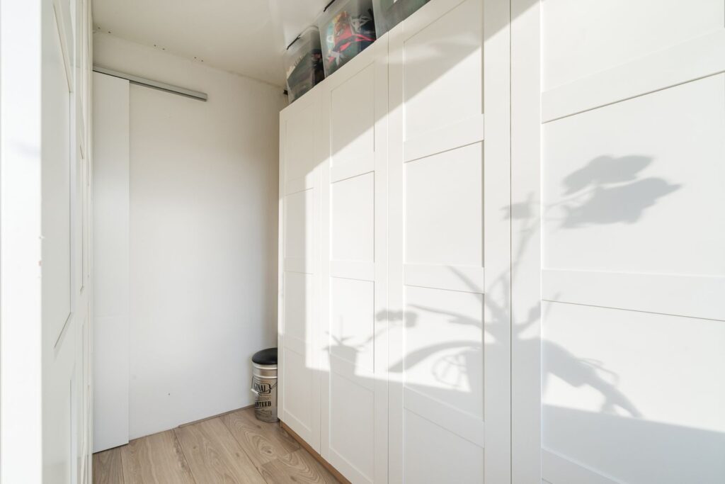 Via de trap in de woonkamer kom je op de ruime overloop, hier vindt je een praktische berging met de opstelling van de wasmachine, droger en de cv-ketel.