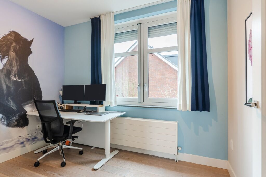 Via een tweede ruime overloop wordt de grote slaapkamer aan de voorzijde bereikt. Aan de achterzijde bevindt zich de tweede slaapkamer op deze verdieping voorzien van een dakkapel en inbouwkasten. Beide kamers zijn royaal en flexibel te gebruiken als slaap-, werk- of hobby kamer.