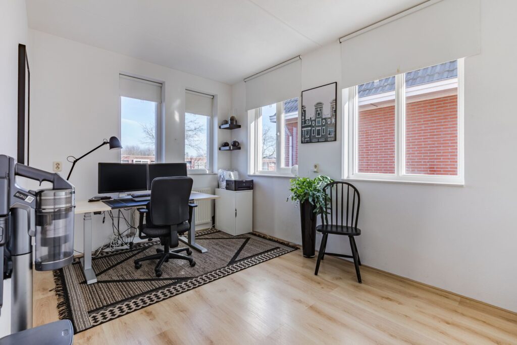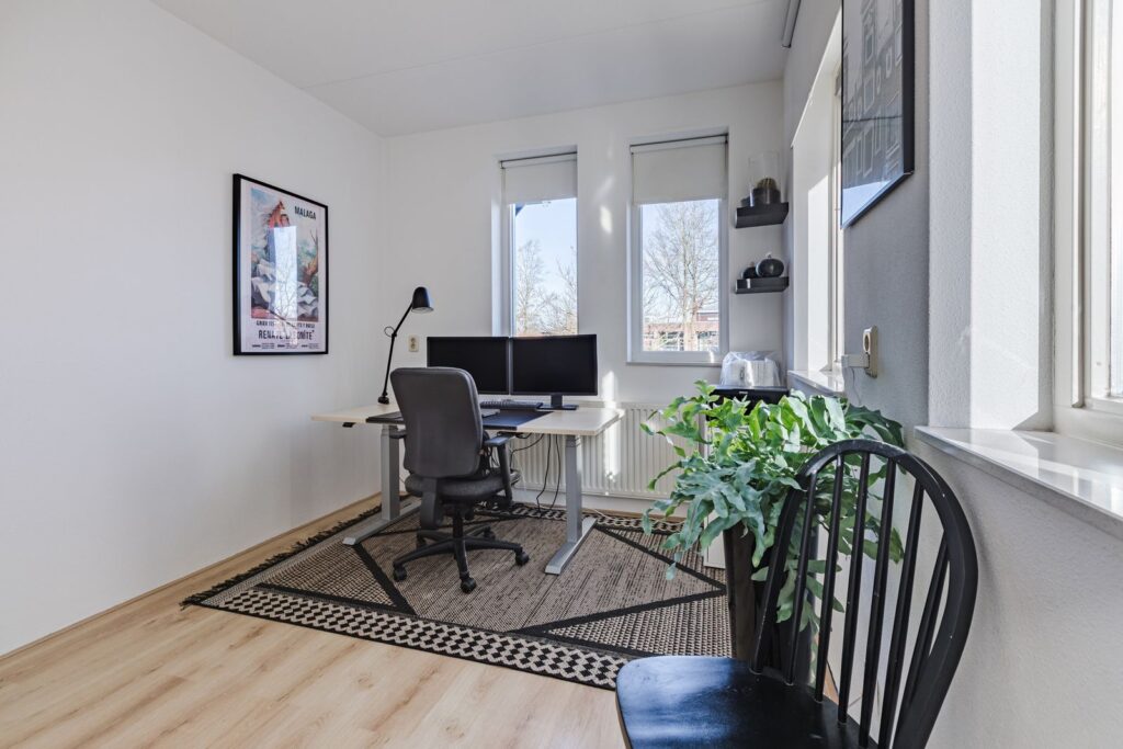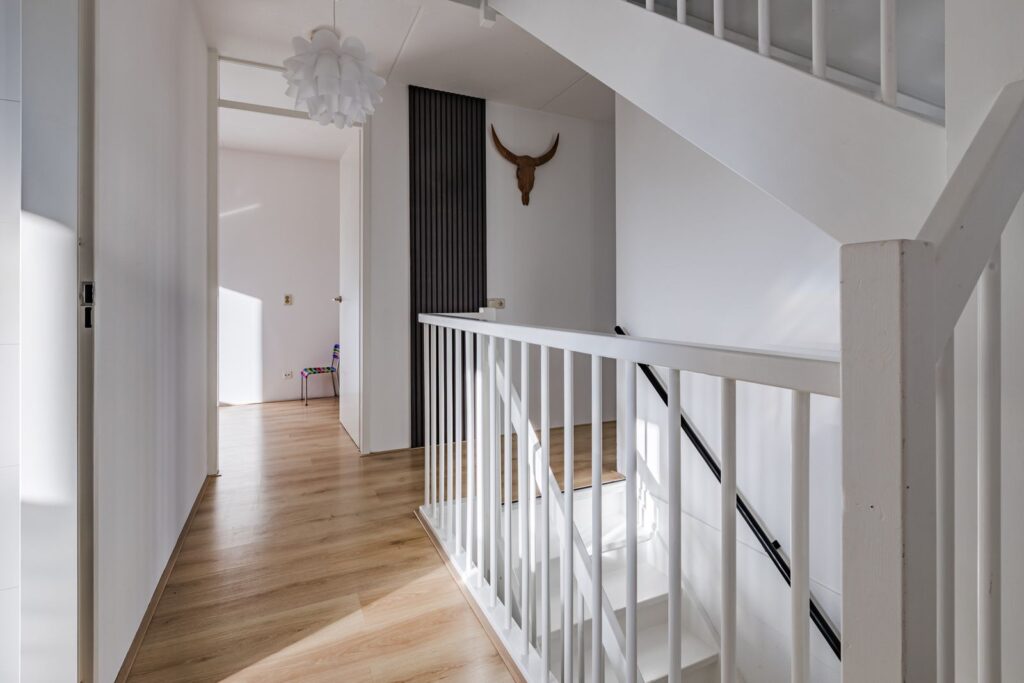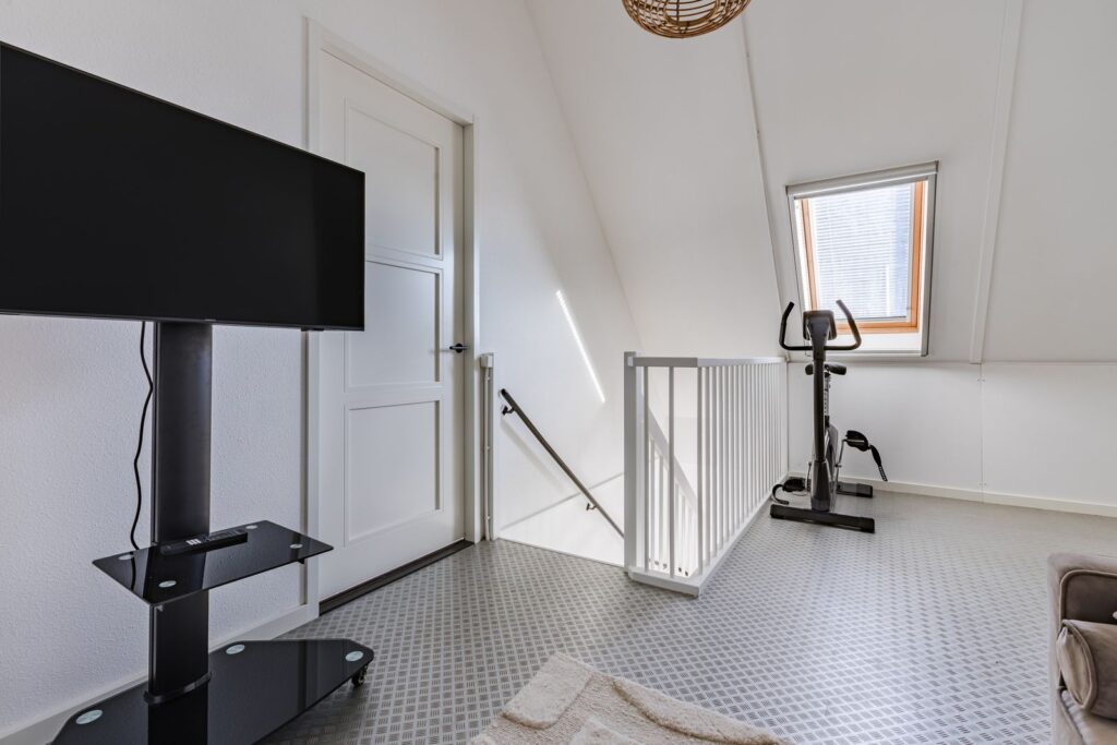De tweede verdieping beschikt over een ruime overloop met vaste werkplek, die tevens uitstekend kan dienen als hobbyruimte of gamehoek. Daarnaast bevinden zich hier een praktisch washok en een royale slaapkamer met inloopkast en airconditioning.
