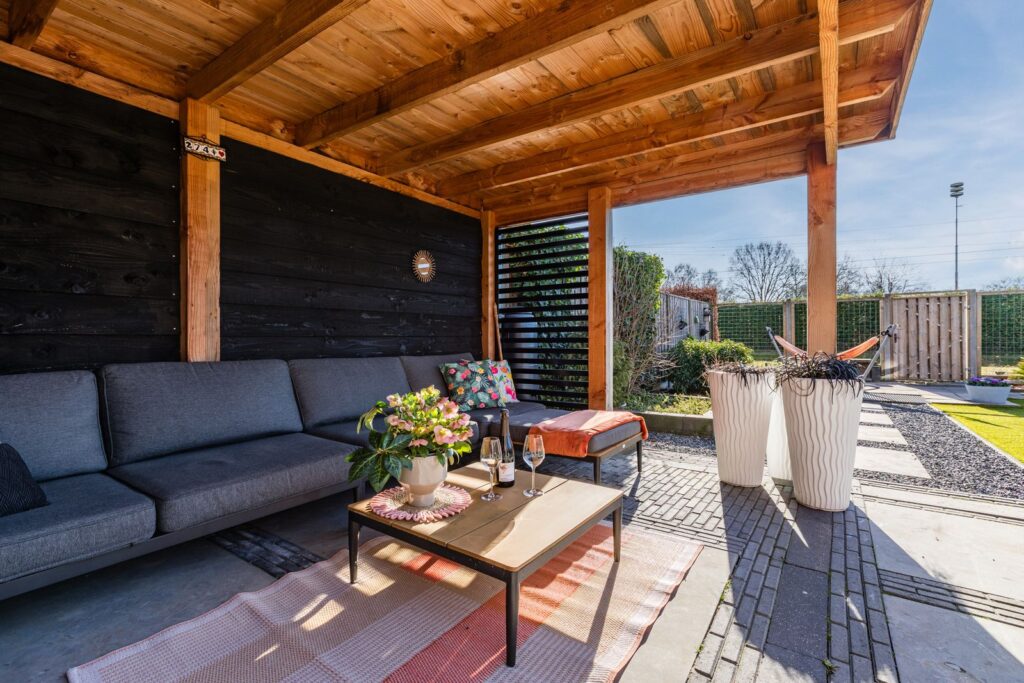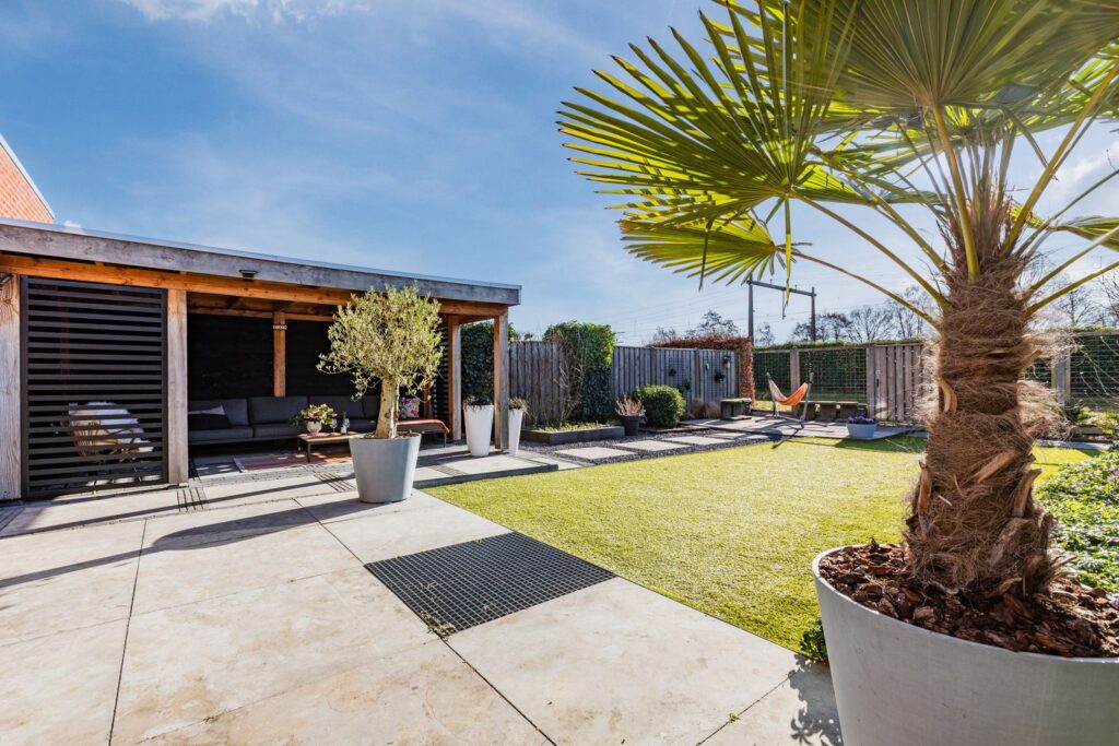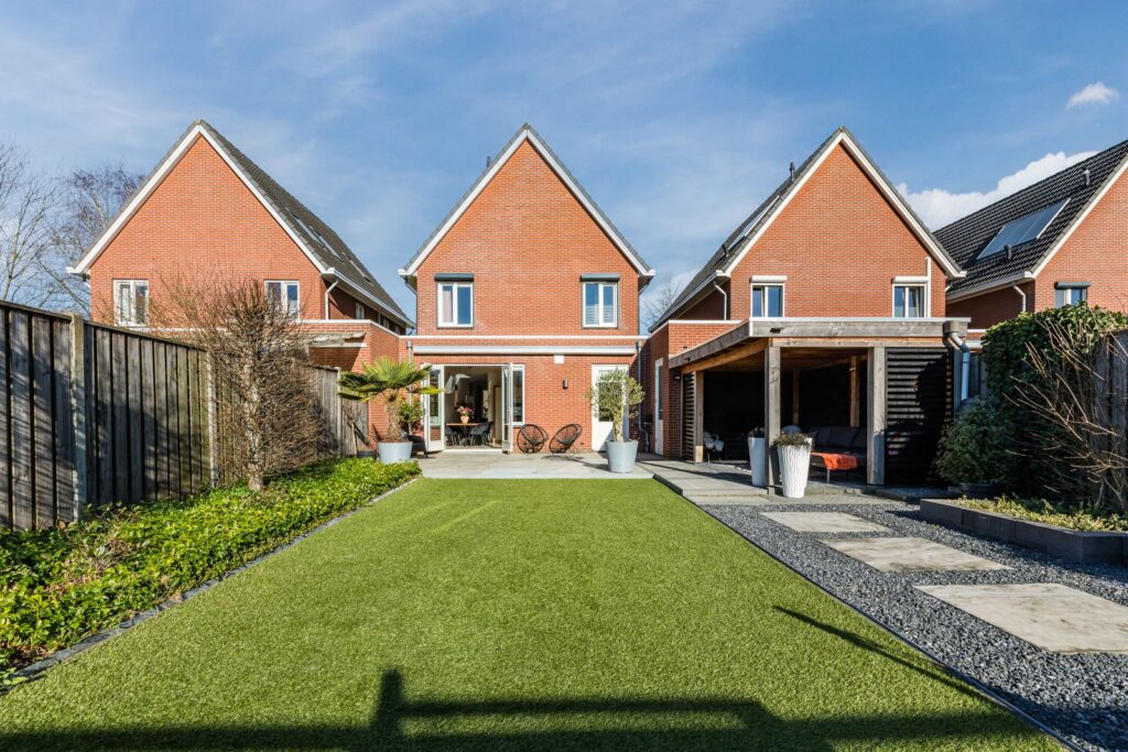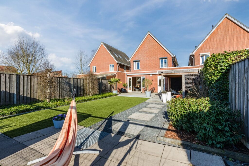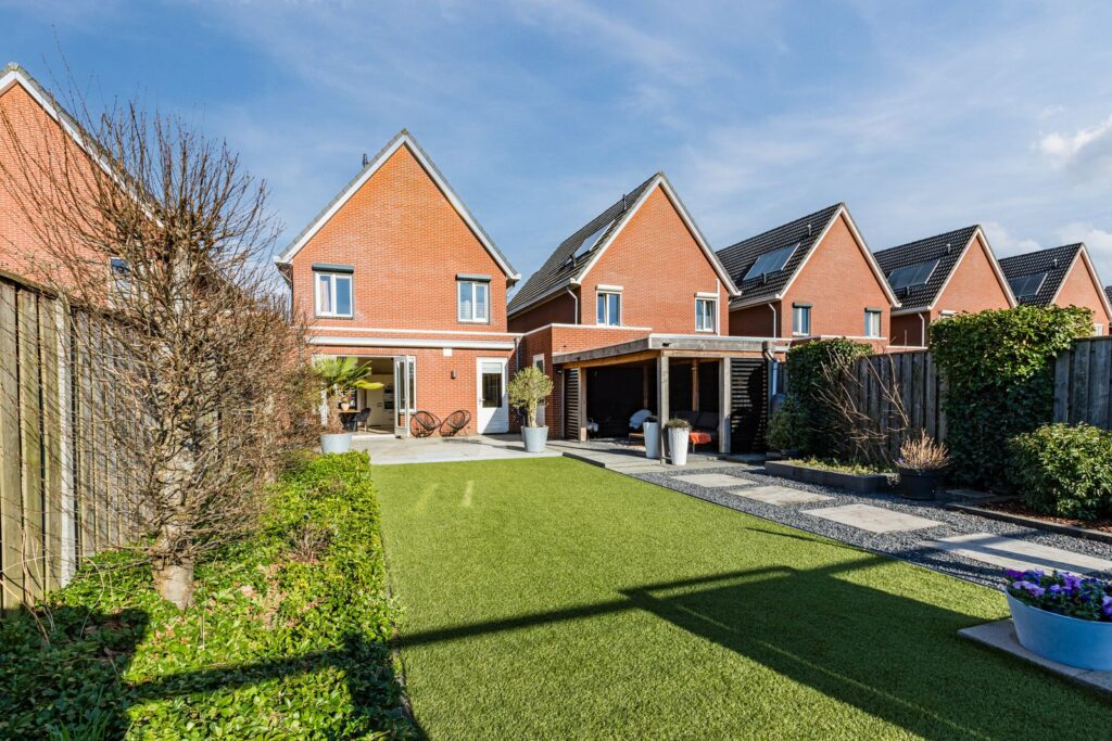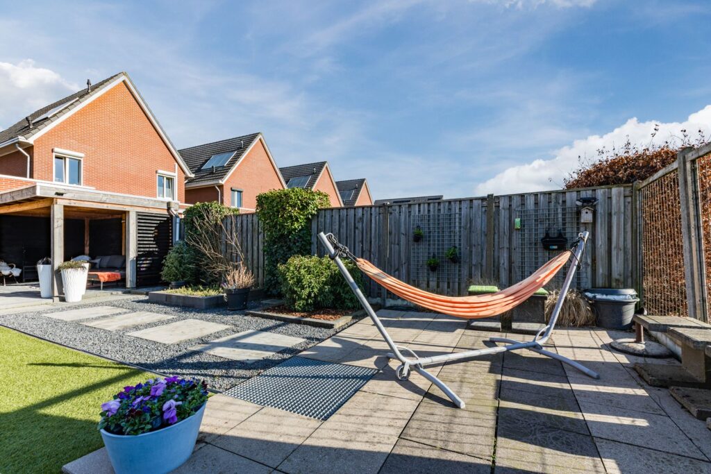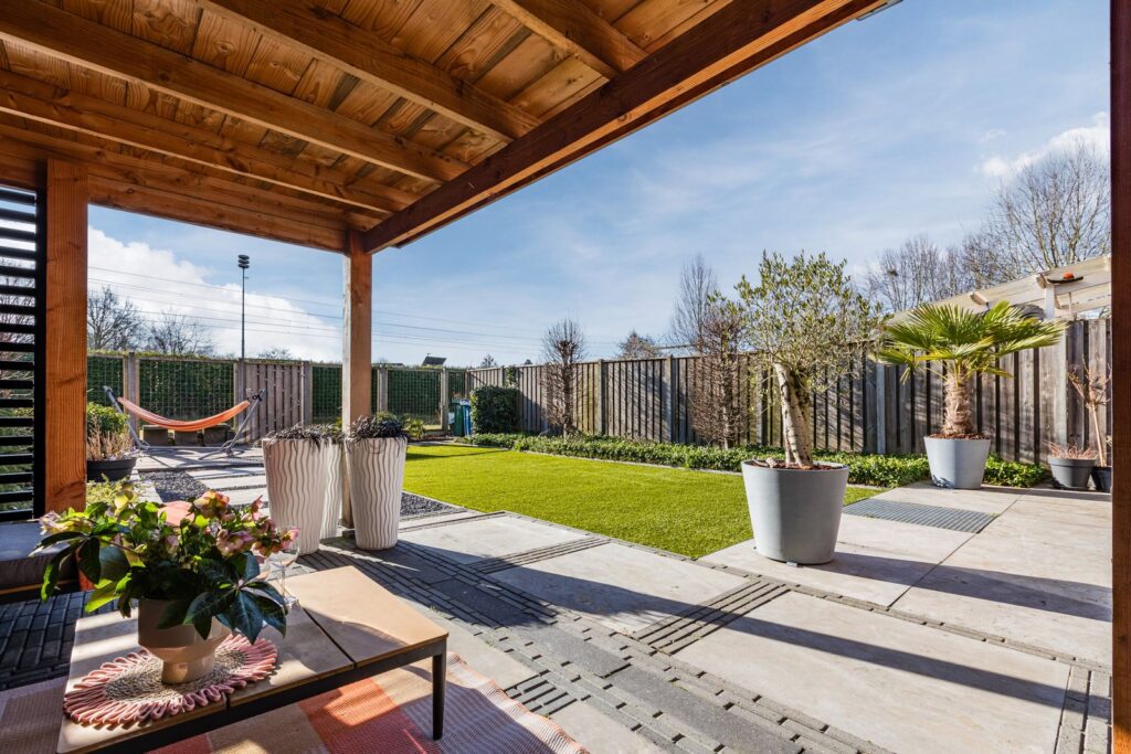 De zonnige en modern aangelegde tuin van ca. 168 m² beschikt over meerdere terrassen, een ruime veranda en een groot elektrisch zonnescherm. Met een royale diepte van ca. 17,4 meter en breedte van ca. 9,7 meter voelt de tuin bijzonder ruim aan. De ligging grenzend aan gemeentegrond zorgt bovendien voor extra privacy en een vrij gevoel.