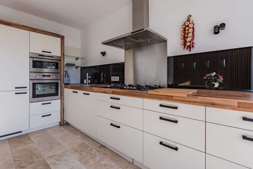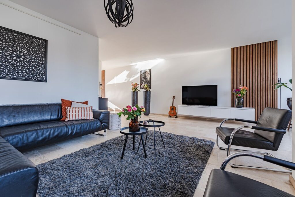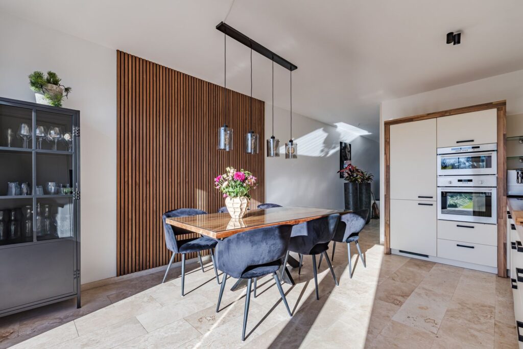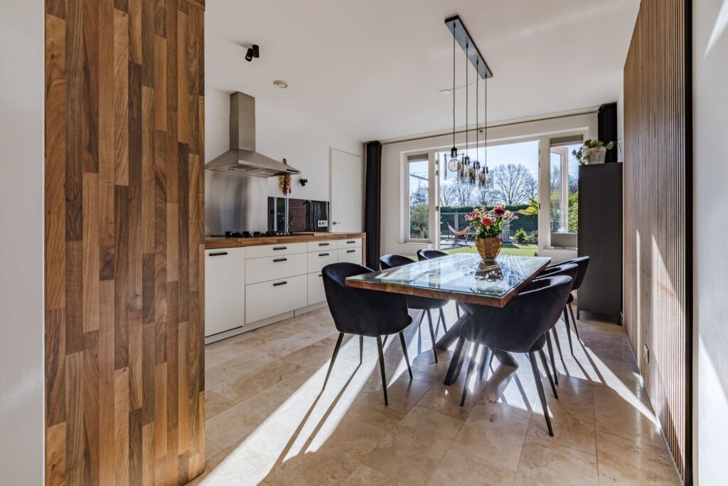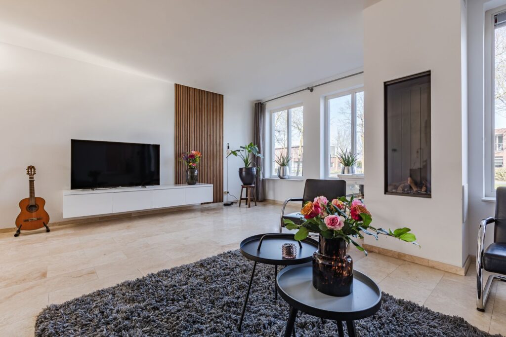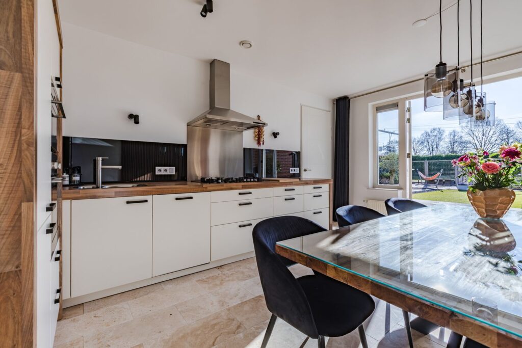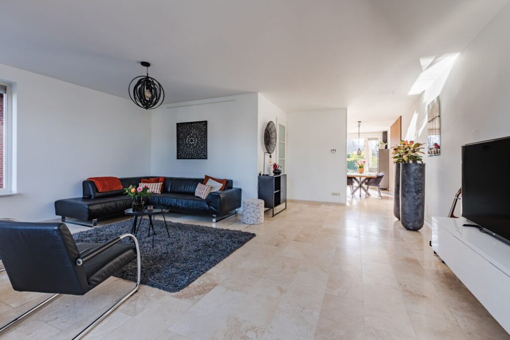 De ruime woonkamer met gashaard beschikt over veel lichtinval en is afgewerkt met gestuukte wanden en een travertin natuurstenen vloer met vloerverwarming. De moderne open keuken is van alle gemakken voorzien en beschikt over openslaande deuren naar de diepe tuin.