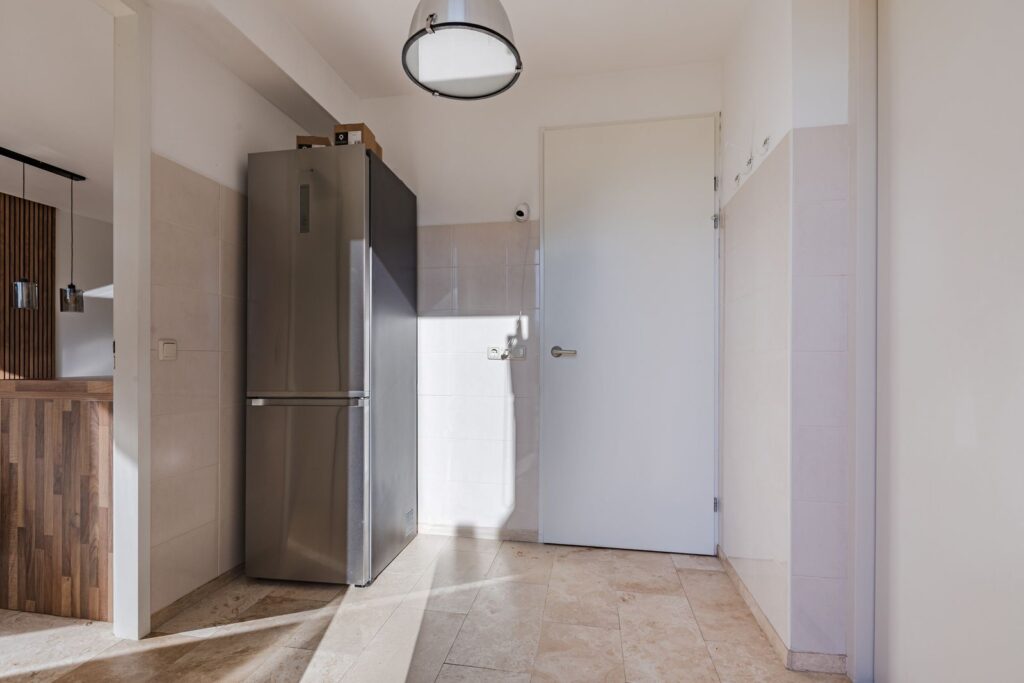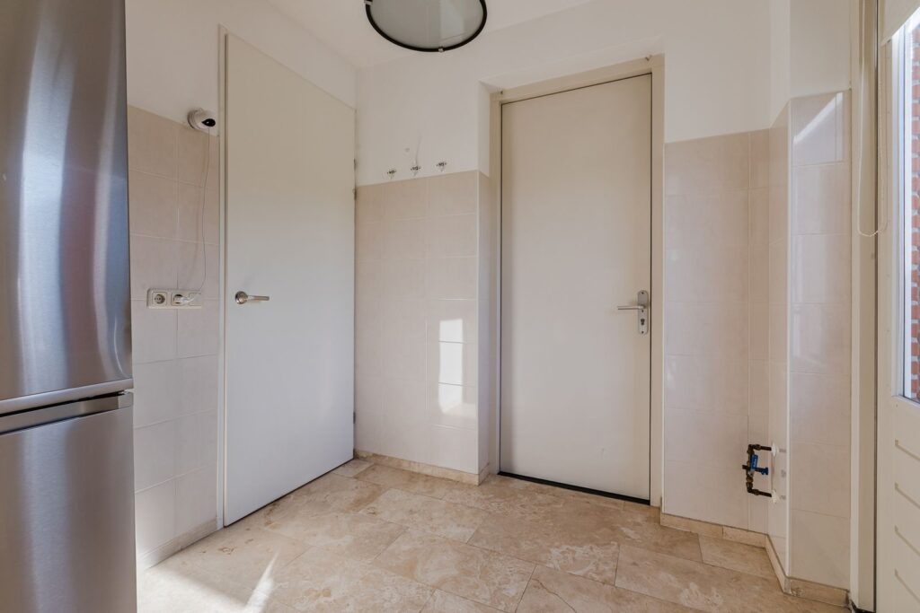 Vanuit de keuken is er toegang tot de bijkeuken met aansluitingen voor de wasapparatuur.