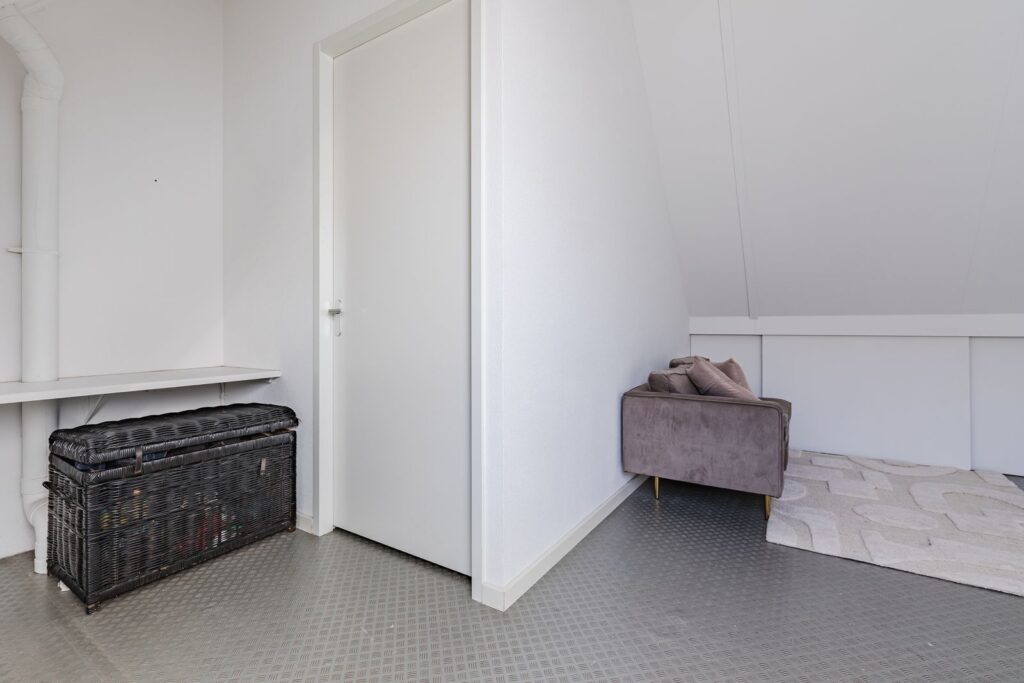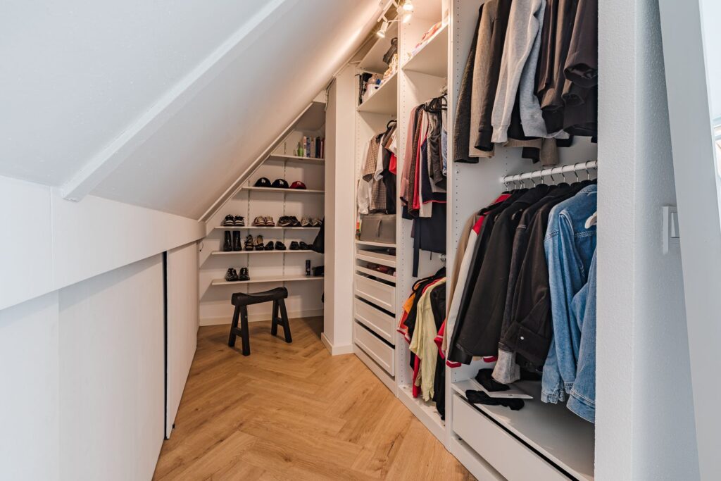 - Zolderverdieping met ca. 22 meter bergruimte achter knieschotten, deels uitgevoerd met schuifdeuren;