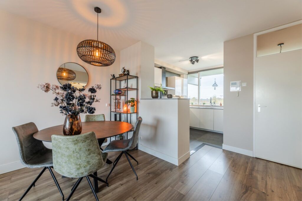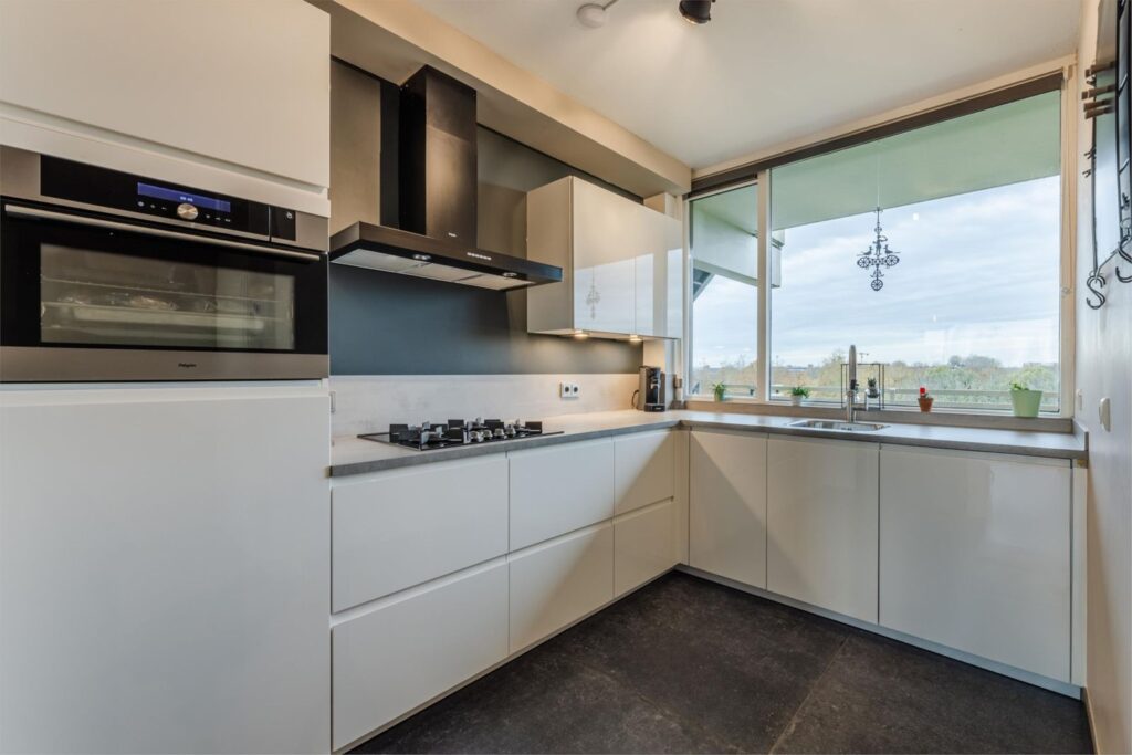 Door de fijne afmeting is er voldoende ruimte voor een eettafel. De halfopen keuken is in 2021 geheel gerenoveerd en is uitgerust met een luxe hoogglans witte inbouwkeuken met betonlook aanrechtblad en diverse inbouwapparatuur, waaronder een gas-op-glas fornuis, afzuigkap, combi stoomoven, koelkast, vaatwasser, Quooker en een uittrekbare carrousel voor de pannen. De mogelijkheid om elektrisch te koken is ook aan gedacht door middel van een perilex en extra kookgroep aansluiting. De vloer in de keuken is voorzien van een grijze tegel.