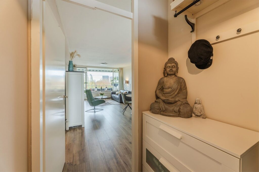 Je betreedt het appartement via de hal met meterkast, die toegang biedt tot de woonkamer. De ruime woonkamer van 27.0 m² is voorzien van een goede laminaatvloer en heeft veel daglicht. Dit komt mede door de grote raamoppervlak, waardoor je vrij uitzicht hebt over groen en een waterpartij. Je komt hier helemaal tot rust!
