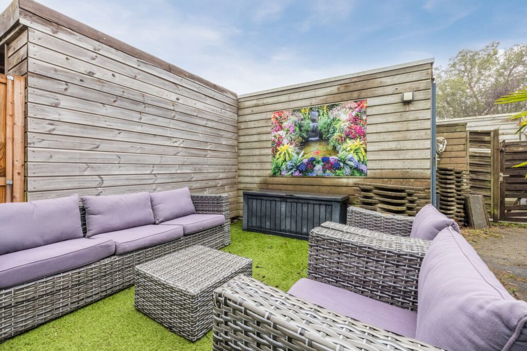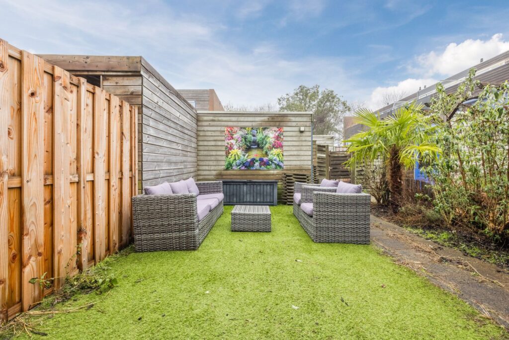 De tuin biedt volop ruimte voor een trampoline, een eettafel én een loungeset tegelijk. Via de achterom bereik je de schuur met elektra. Daarnaast zijn er een zonnescherm, een buitenkraan en de mogelijkheid om de woonkamer in de toekomst uit te bouwen.