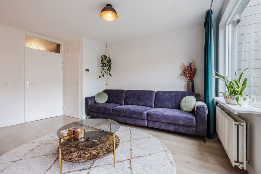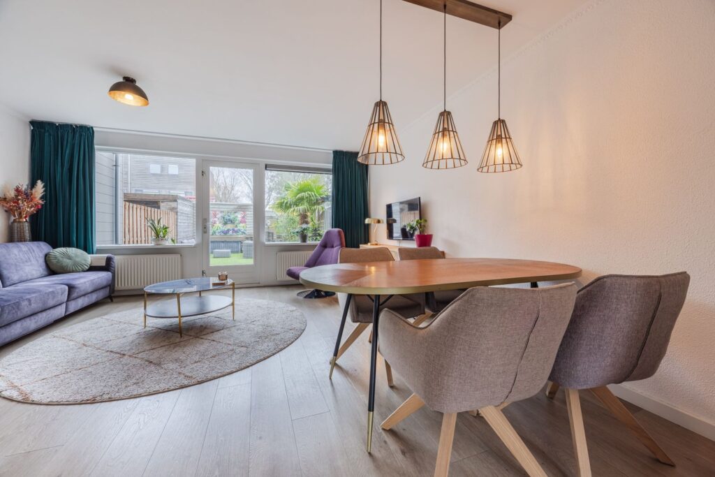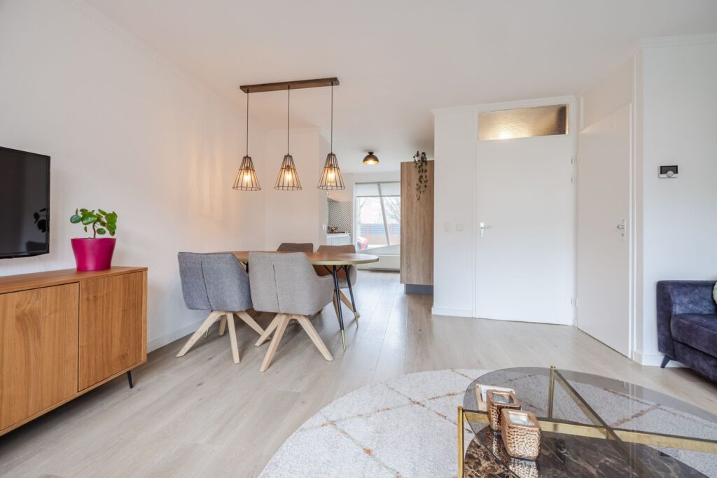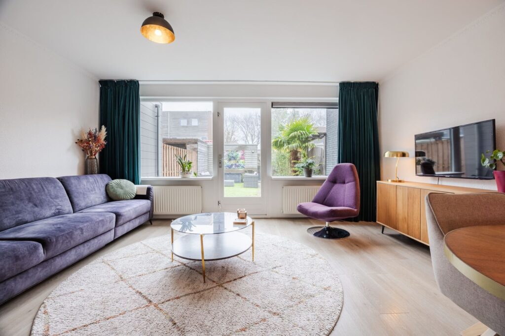 Via de hal met toilet kom je in een lichte, ruime woonkamer waar de grote raampartijen naar de achtertuin zorgen voor veel licht en een fijne verbinding tussen binnen en buiten.