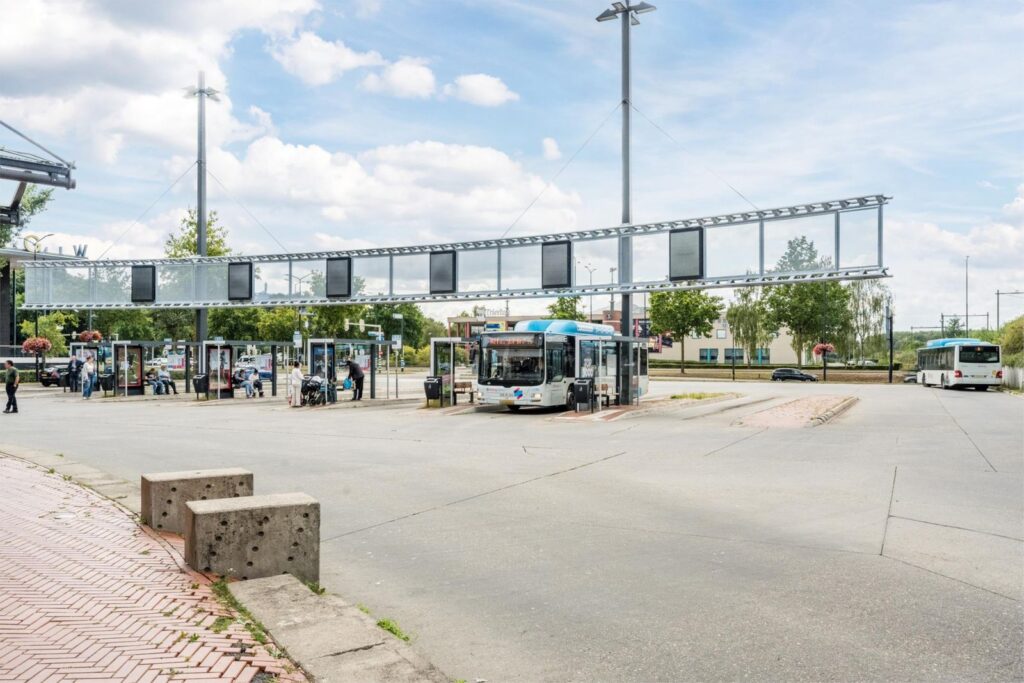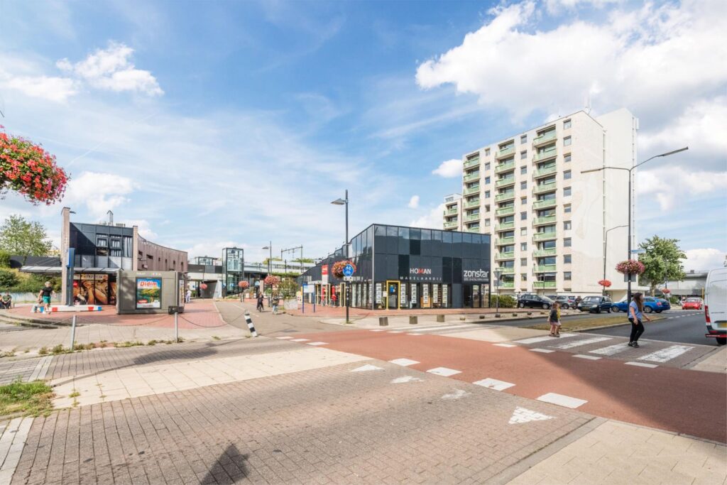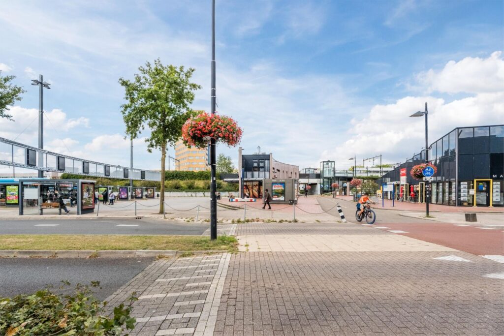 Aan de linkerkant naast het gebouw is het treinstation Dukenburg met aan de voorkant het busstation van de stadsbussen en streekbussen.
