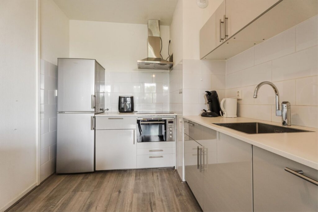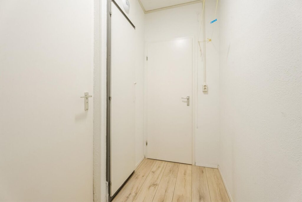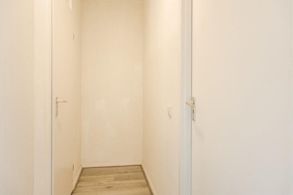 Entree/hal met links een deur naar bergruimte, waarin aansluiting voor wasmachine. De hal doorgelopen, kom je in de woonkamer met halfopen keuken. De keuken is voorzien van een vaatwasser, combi-oven, inductie kookplaat en koel/vriescombinatie. Voor de woonkamer is over de hele breedte het balkon (gelegen op oost, dus kan je genieten van de ochtendzon op het balkon). Aan de linkerkant In de woonkamer is een deur tot een gang met aan de rechterkant de (ruime)slaapkamer die grenst aan de woonkamer en aan de linkerkant in deze gang toegang tot de badkamer met douche en wastafel en toegang tot de (aparte) WC met fonteintje. Meterkast bevindt zich op de gang naast de voordeur.