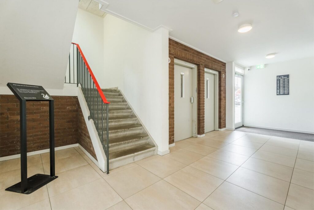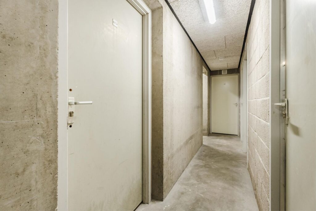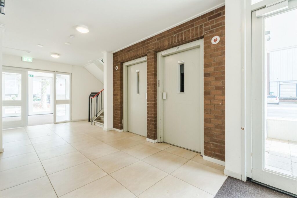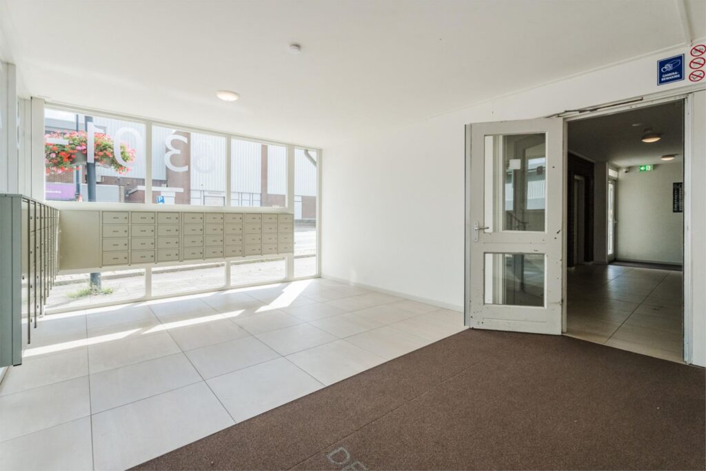 Centrale entree (via intercom), brievenbussen in de hal, liften naast trappenhuis en toegang tot de afgesloten (fietsen) berging/box.