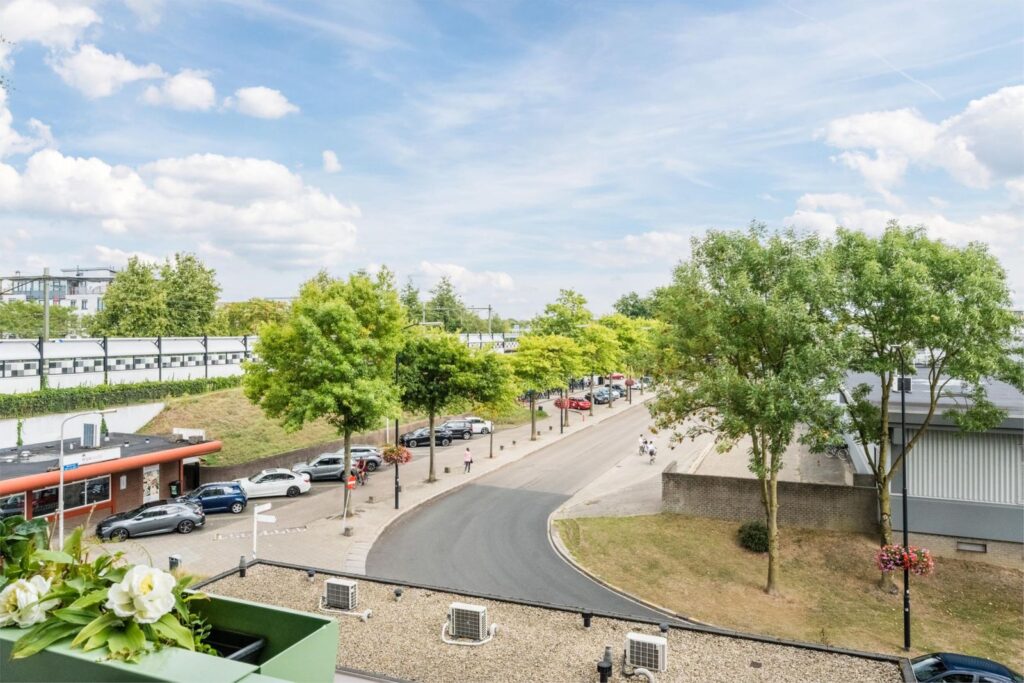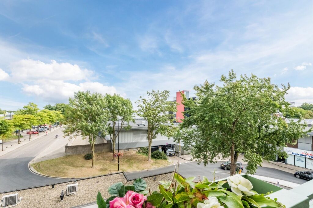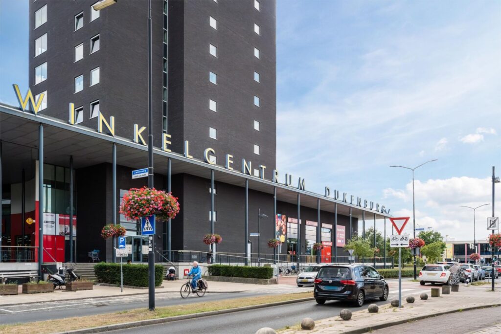 Vanuit de woonkamer heb je vrij uitzicht over de straat met aan de rechterkant het overdekte grootwinkelcentrum Dukenburg, waarin ook een Albert Heijn XL is.